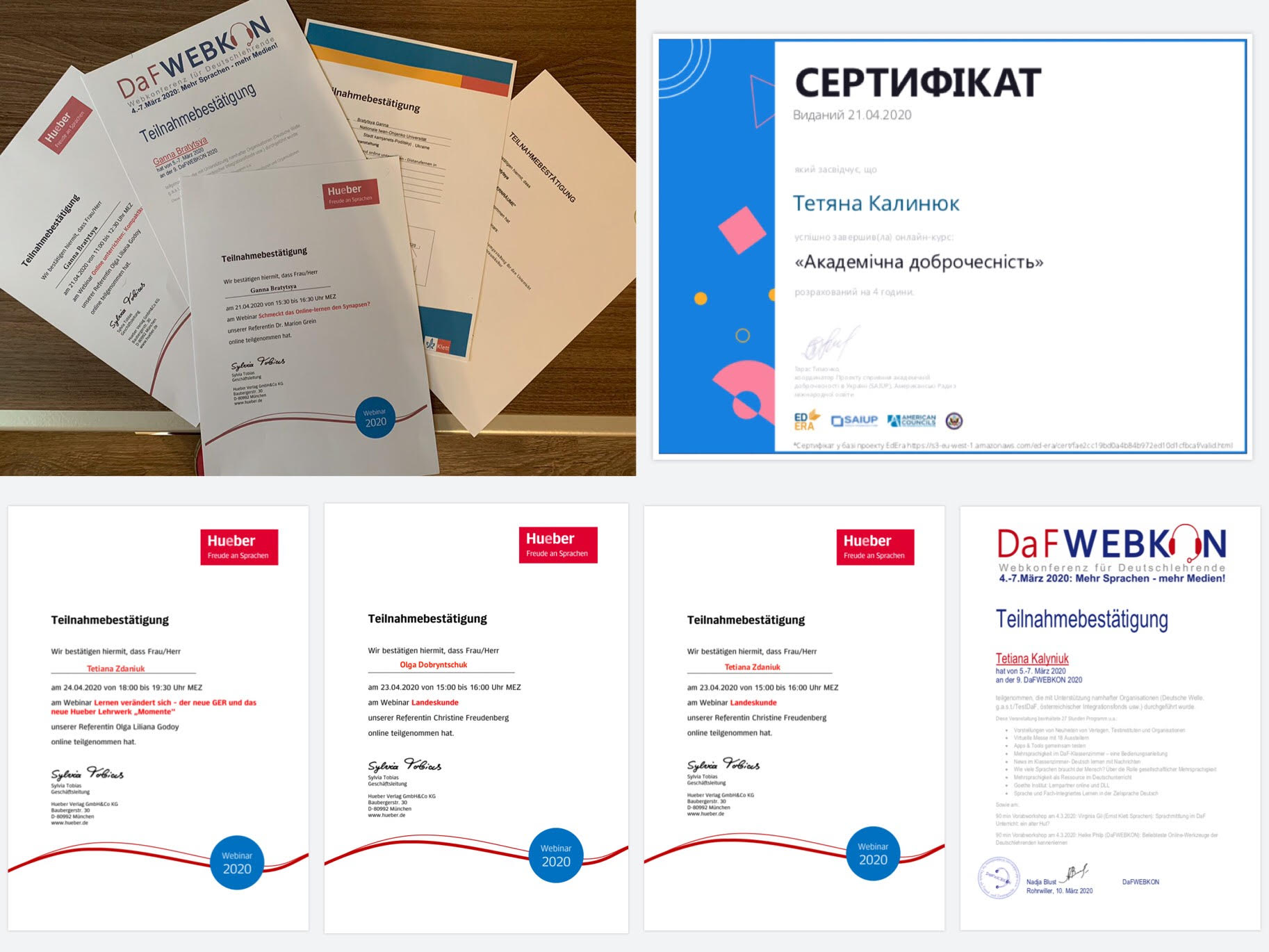 У цей непростий час «корона-кризи» науково-педагогічні працівники кафедри німецької мови брали та беруть активну участь у цілій низці семінарів, курсів, вебінарів, воркшопів всеукраїнського, європейського і, навіть, світового формату.