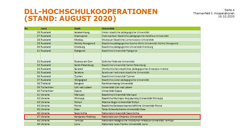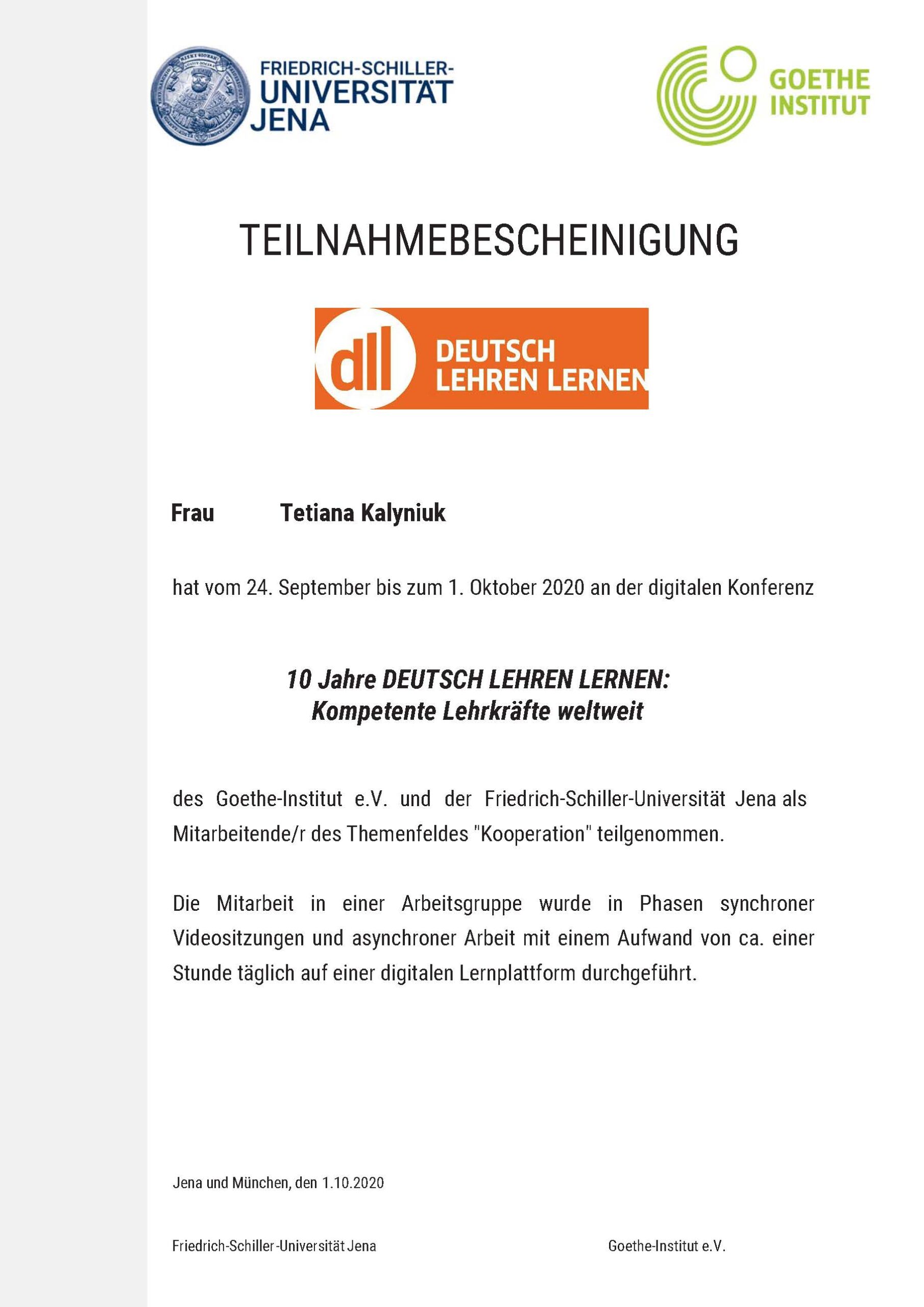 З 24 вересня по 1 жовтня за сприяння наукової спільноти Є́нського університету імені Фрідріха Шиллера відбулася 10 віртуальна ювілейна конференція DLL (Deutsch Lehren Lernen: Вчимо навчати німецької). Зустріч об’єднала DLL-тренерів з усього світу, науковці, авторів та учасників програм DLL, представників європейських культурних інституцій, університетів, інститутів підвищення кваліфікацій.