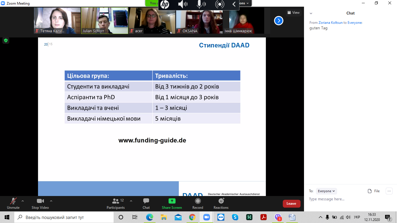 Цьогорічна зустріч з лектором ДААД відбулася в онлайн форматі, під час якої Юліан Шорр розповів про можливості отримання стипендій здобувачами та викладачами у найрізноманітніших галузях. Дав практичні поради як обрати університет та як успішно підготувати мотиваційний лист. Сподіваємося, що і цього року стипендії будуть отримані і, не зважаючи на пандемію, буде можливість відвідати Німеччину та отримати неоціненний досвід .