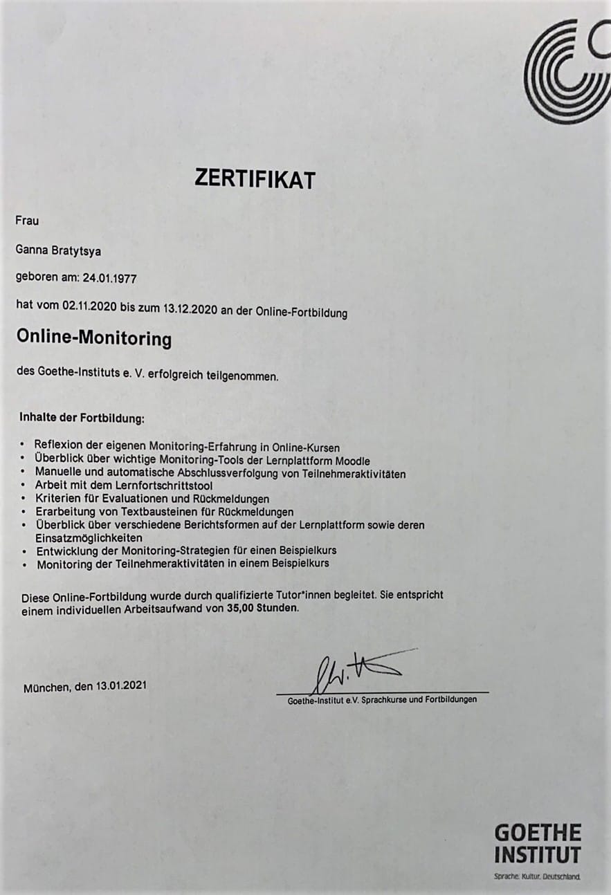 Вітаємо старшого викладача кафедри німецької мови Ганну Братицю з успішним завершенням підвищення кваліфікації закордоном онлайн „Online-Monitoring“ (м. Мюнхен, Німеччина)! 6 цікавих та насичених тижнів, 35 годин індивідуальної роботи та сертифікат від Goethe Institut (München)!