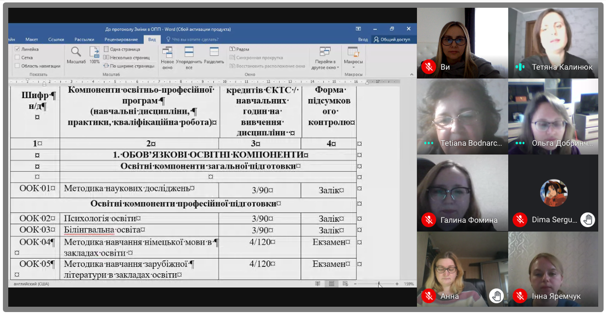 22 березня 2021 року на платформі GoogleMeet відбулося розширене засідання кафедри німецької мови. Предметом обговорення стало затвердження нової освітньо-професійної програми Середня освіта (Мова і література (німецька, англійська) першого (бакалаврського) рівня вищої освіти спеціальності 014 Середня освіта (Мова і література (німецька) галузі знань 01 Освіта/Педагогіка, а також затвердження змін до чинних програм першого (бакалаврського) та другого (магістерського) рівнів вищої освіти.