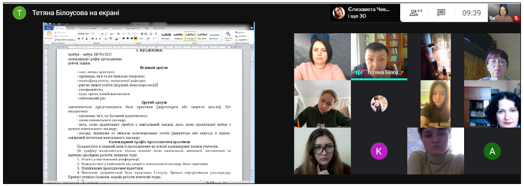 Керівник практики факультету доцент Білоусова Т.П. проінформувала здобувачів про обсяг і зміст звітної документації з практики, особливості проведення цього виду навчальної роботи у період карантину, про правила техніки безпеки під час практики.