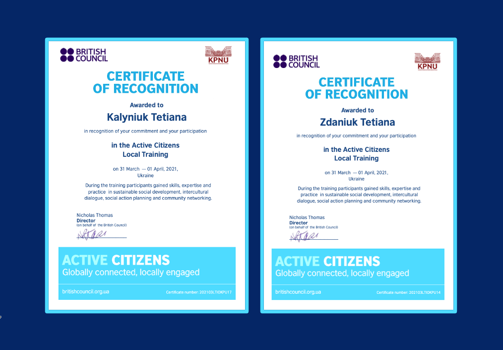 Науково-педагогічні працівники кафедри німецької мови – завідувач кафедри, доцент Тетяна Калинюк, доцент Тетяна Зданюк, викладач Тетяна Гавловська та студенти факультету іноземної філології – Даша Усенко (Nim1B20), Єлезавета Нетеча (Ang1B19) та Анна Попик (Ang1B19) впродовж 31 березня – 01 квітня 2021 року в Кам’янці-Подільському пройшли навчання на віртуальному локальному тренінгу «Активні Громадяни» за програмою у галузі міжкультурного діалогу і соціального розвитку Британської Ради.
