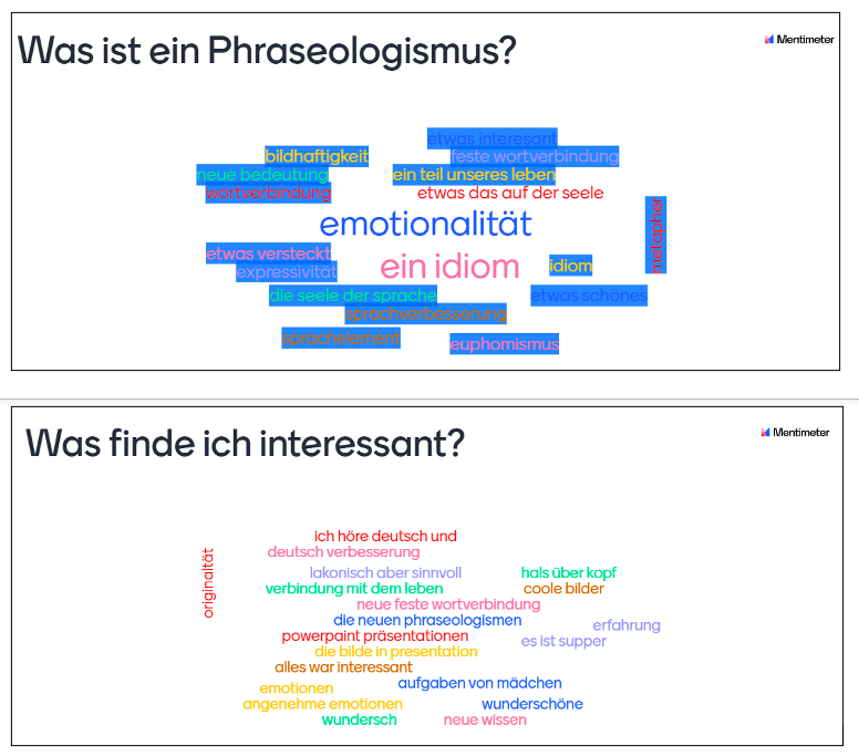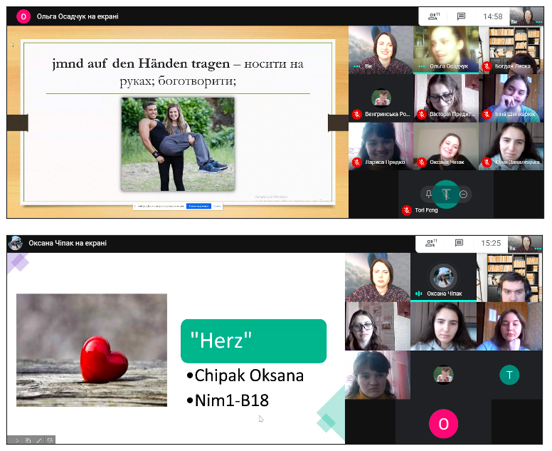 Гуртківці представили звітні матеріали індивідуальних дослідницьких тем, які стосувалися особливостей використання соматизмів у німецьких фразеологізмах. Засідання розпочалося з короткого опитування у Mentimeter, де студенти висловилися щодо того, як часто вони використовують сталі вирази у розмові, на письмі тощо, яку їх роль уцілому.