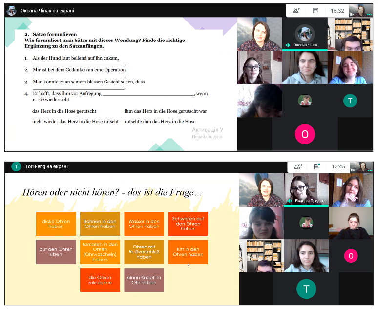 Гуртківці представили звітні матеріали індивідуальних дослідницьких тем, які стосувалися особливостей використання соматизмів у німецьких фразеологізмах. Засідання розпочалося з короткого опитування у Mentimeter, де студенти висловилися щодо того, як часто вони використовують сталі вирази у розмові, на письмі тощо, яку їх роль уцілому.