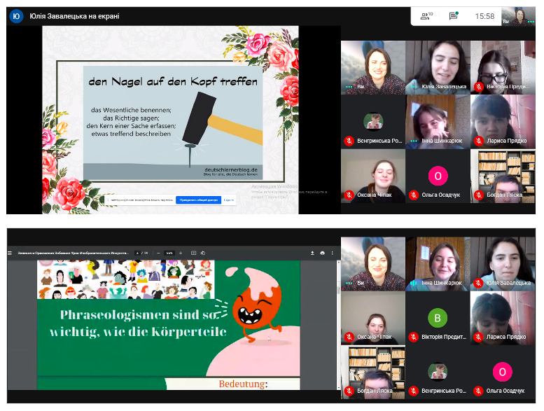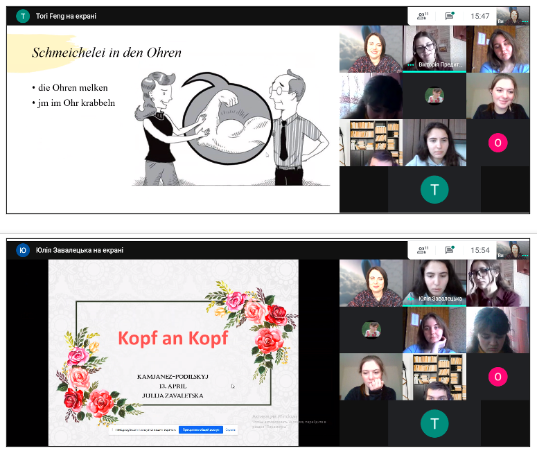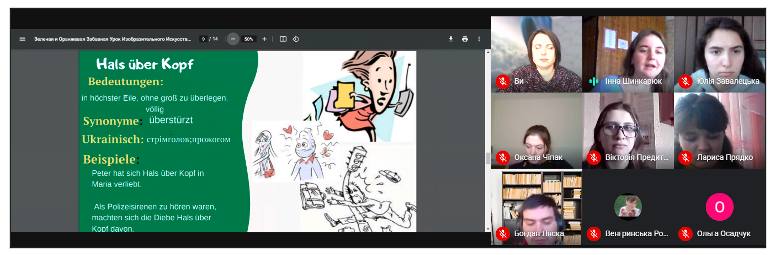 13 квітня 2021 року відбулося онлайн-засідання наукового гуртка „DeutschePhraseologie“, учасниками якого є студенти-германісти 2-3 курсів факультету іноземної філології. Науковий керівник – доцент Тетяна Калинюк.