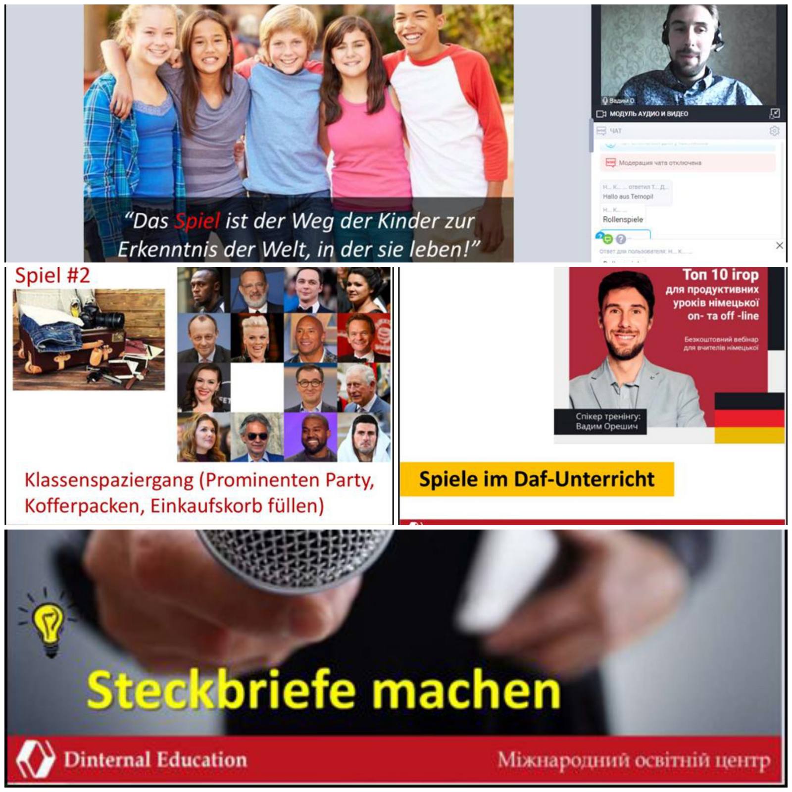 На онлайн-тренінгу учасники дізналися про особливості вибору та використання різних видів ігор на уроках німецької мови з урахуванням ключових критеріїв (вік, рівень володіння німецькою мовою, комунікативні цілі уроку, навички учнів тощо); методику організації ігрової діяльності відповідно до конкретних цілей навчання тощо. Спікер тренінгу Вадим Орешич представив топ 10 ігор, які, на його думку, є універсальними та ефективними на будь-якому рівні навчання мови, а також відзначив онлайн-застосунки, які допоможуть провести урок німецької мови цікаво та динамічно, підвищать мотивацію до вивчення мови.