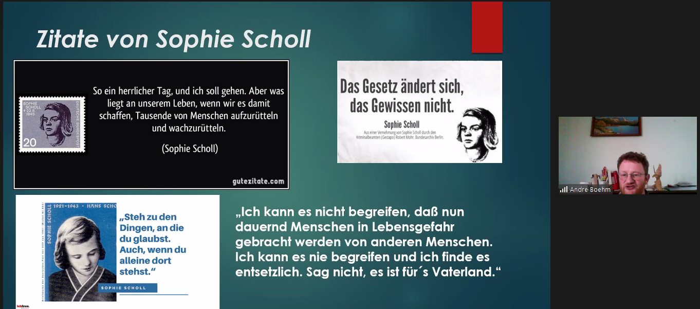 Співпраця кафедри німецької мови із Німецькою службою академічних обмінів DAAD цьогоріч продовжується в онлайн-форматі. 11 травня 2021 року DAAD-лектор Andre Böhm провів для студентів-германістів факультету іноземної філології К-ПНУ імені Івана Огієнка країнознавчий воркшоп „Sophie Scholl und die Weiße Rose“, який реалізується за підтримки Фонду Ганнса Зайделя (Hanns-Seidel-Stiftung), Асоціації українських германістів. Цікаві факти та змістовні презентації, обмін думками про минуле та сьогодення, про ціну життя та самопожертву – усе це стало предметом обговорення учасниками освітнього заходу.
