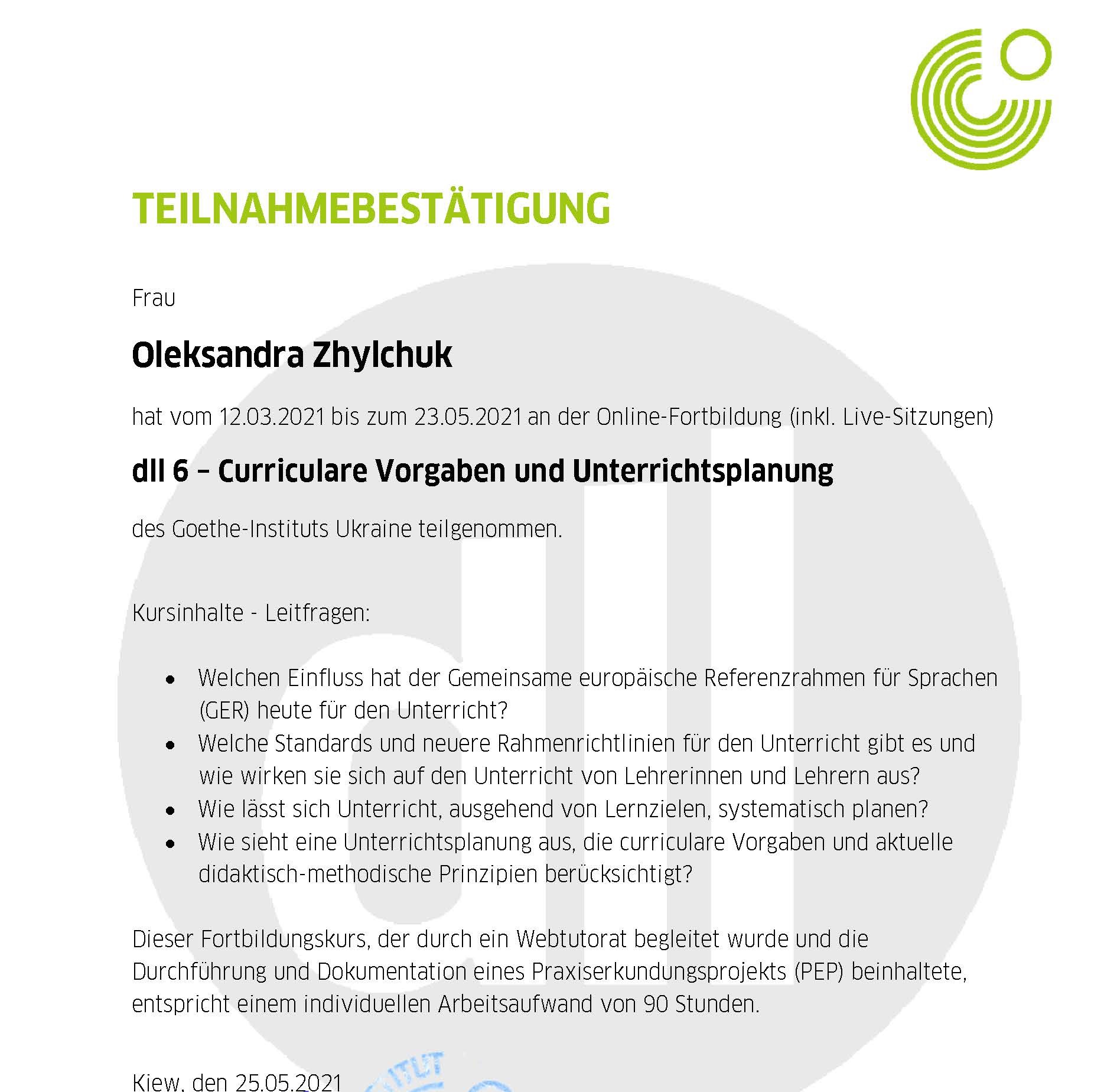 Щиро вітаємо Олександру Жильчук випускницю факультету іноземної філології спеціальності 014 Середня освіта (Мова і література (німецька), а тепер вчителя німецької мови Кам’янець-Подільського ліцею І-ІІІ ступенів «Славутинка» Хмельницької обласної ради з успішним завершенням навчання за програмою Goethe-Institut «DLL 6: Curriculare Vorgaben und Unterrichtsplanung».