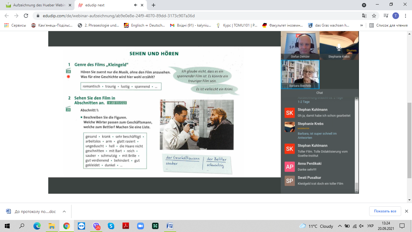 17 вересня 2021 року завідувачка кафедри німецької мови, доцентка Тетяна Калинюк взяла участь у вебінарі від видавництва Hueber „Reihe 3plus1: Wege zu einer Film–Literacy – entdeckendes Lernen mit fiktionalen Filmen“. Предметом обговорення були основні аспекти формування іншомовної комунікативної компетентності, а саме розуміння німецькомовного відео. На прикладі фрагменту „Kleingeld“ до навчального посібника Sicher B1+ пані Барбара Блехеле презентувала новий формат його опрацювання.