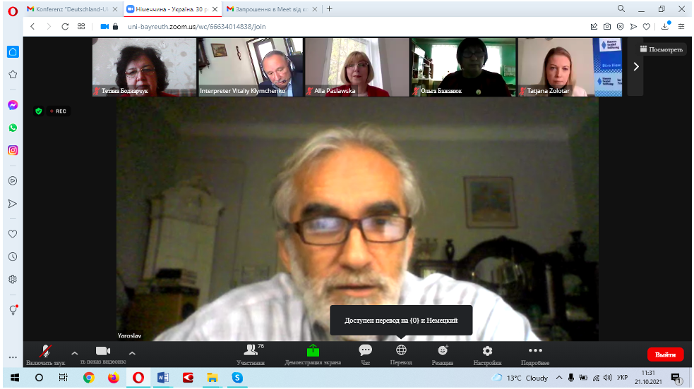 21 жовтня 2021 року науково-педагогічні працівники кафедри німецької мови у рамках співпраці із Асоціацією Українських Германістів взяли участь у роботі Міжнародної конференції «Deutschland – Ukraine. 30 Jahre Zusammenarbeit mit historischen Wurzeln» (онлайн). Метою конференції було представити останні 30 років співпраці між Україною та Німеччиною, а також історію німецько-українських взаємин до здобуття незалежності Української держави. З доповідями виступили відомі українські та німецькі історики, мовознавці та літературознавці, письменники та культурологи.