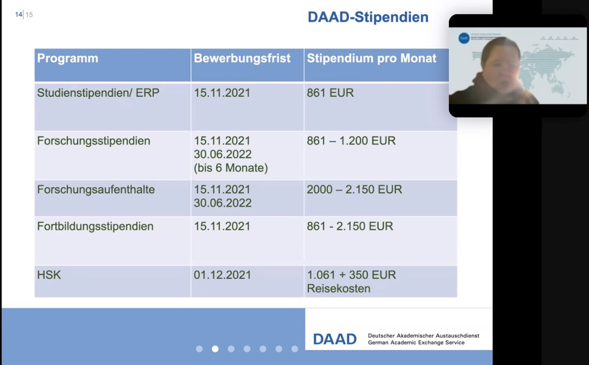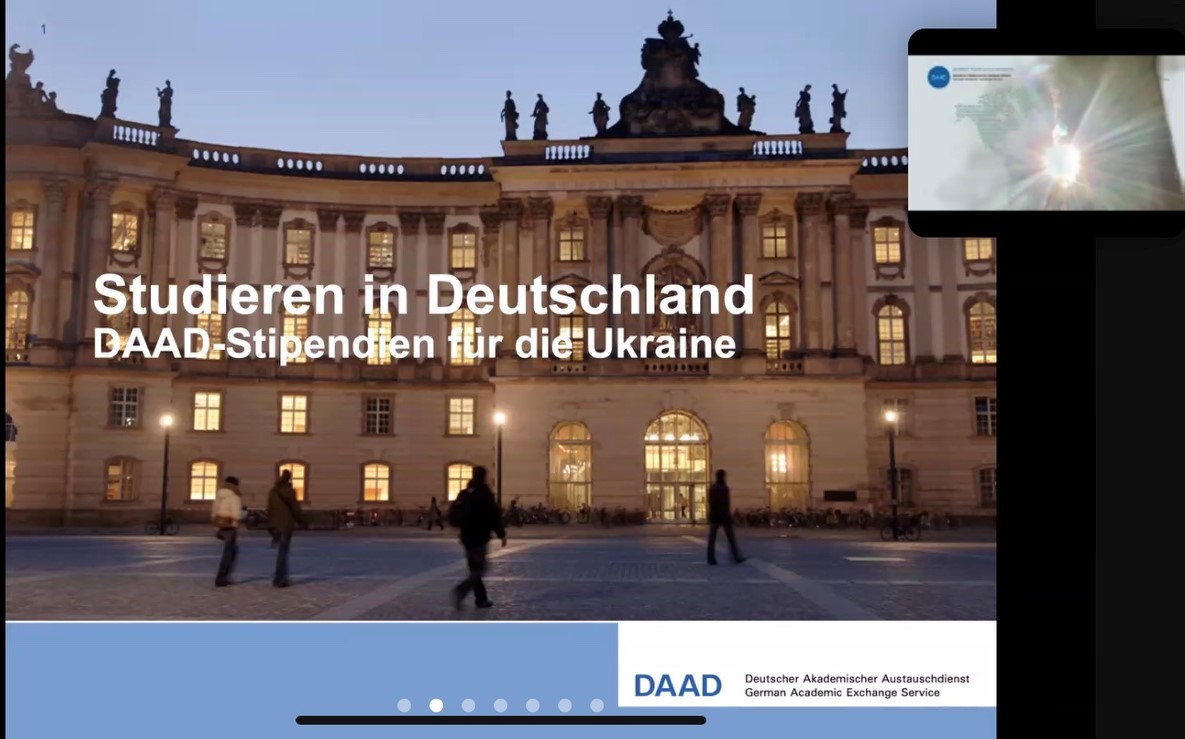 Колишні стипендіати Біанка Пінтіліє (Bianca Pintilie) (зараз мовна асистентка DAAD в Чернівцях) і Йона Ґетсбі (практикант Центру Gedankendach) поділилися порадами щодо процесу підготовки документів, а також розказали про своє навчання у рамках стипендій DAAD у містах Гайдельберґ і Мюнхен.