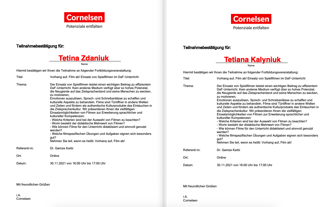Участь у вебінарі «Vorhang auf, Film ab! Einsatz von Spielfilmen im DaF-Unterricht»
