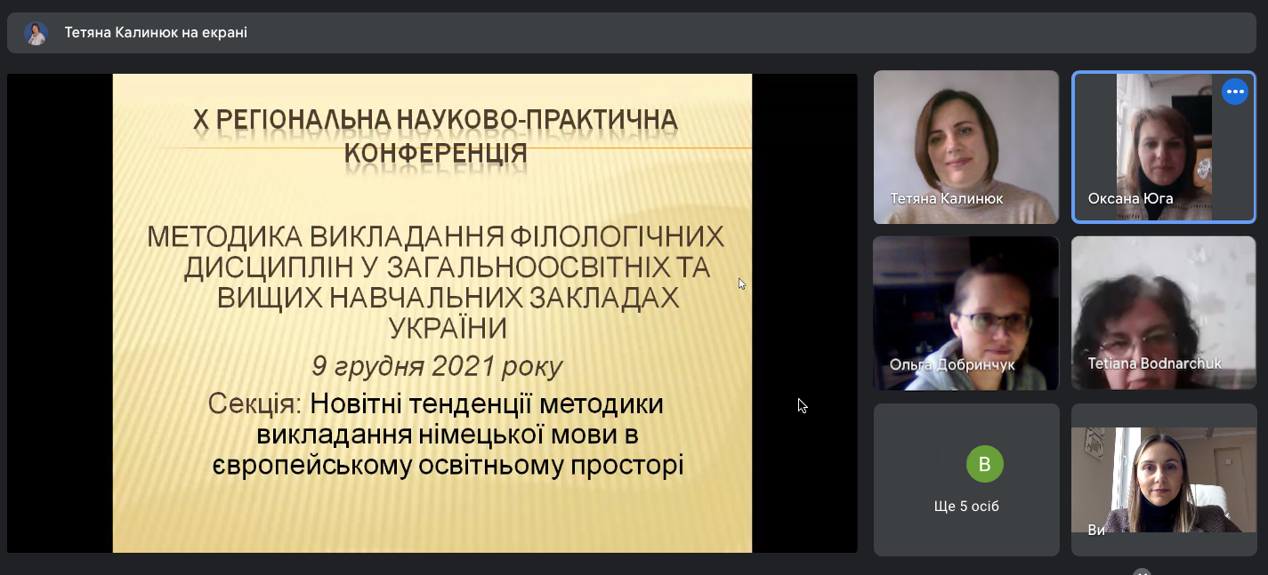 9 грудня 2021 року відбулася X Регіональна науково-практична конференція «Методика викладання філологічних дисциплін у загальноосвітніх та вищих навчальних закладах України», яка традиційно проходить на факультеті іноземної філології КПНУ імені Івана Огієнка. У роботі секції взяли участь науково-педагогічні працівники кафедри німецької мови, вчителі закладів загальної середньої освіти та здобувачі вищої освіти. У рамках реалізації наукового співробітництва між кафедрою німецькою мовою та навчальними закладами, своє бачення нагальних проблем шкільної освіти представили вчителі німецької та англійської мов С. Томашевська, О. Юга, О. Крижановська.