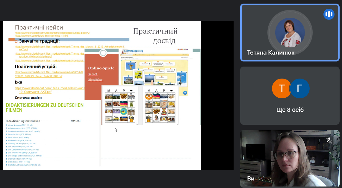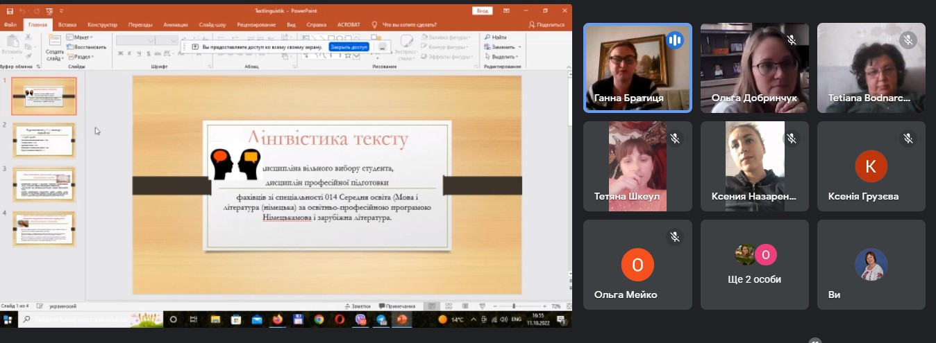 11 жовтня 2022 року відбулася онлайн-зустріч викладачів кафедри німецької мови зі здобувачами 1 курсу другого (магістерського) рівня вищої освіти спеціальностей Середня освіта (Мова і література (німецька) та Середня освіта (Мова та література (англійська) з метою ознайомлення зі змістом та завданнями навчальних дисциплін вільного вибору, які пропонує кафедра німецької мови у 2022-2023 н.р.