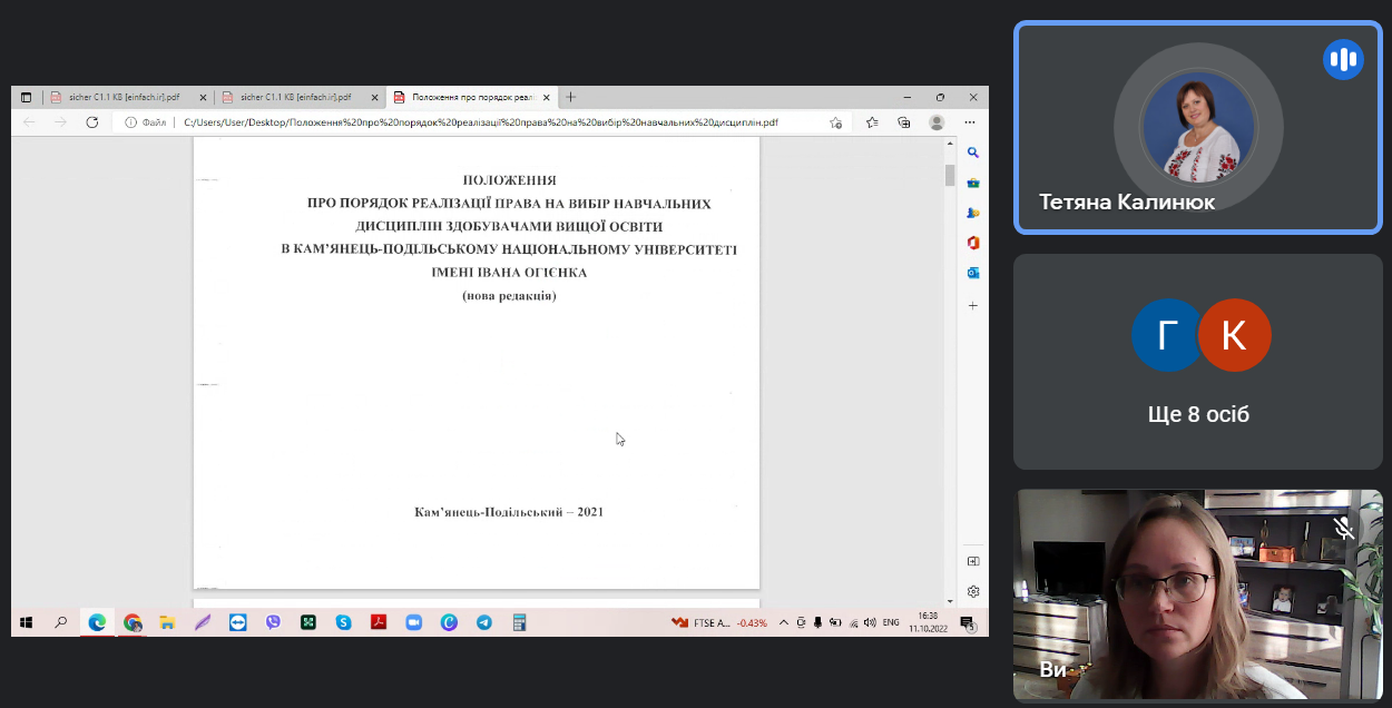 На початку зустрічі завідувач кафедри, доцент Тетяна Калинюк детально розповіла про процедуру обрання дисциплін вільного вибору на основі Положення про порядок реалізації права на вибір навчальних дисциплін здобувачами вищої освіти в Кам’янець-Подільському національному університеті імені Івана Огієнка (нова редакція), а також наголосила на тому, де здобувачі можуть ознайомитися з усім переліком дисциплін вільного вибору (Каталогом).