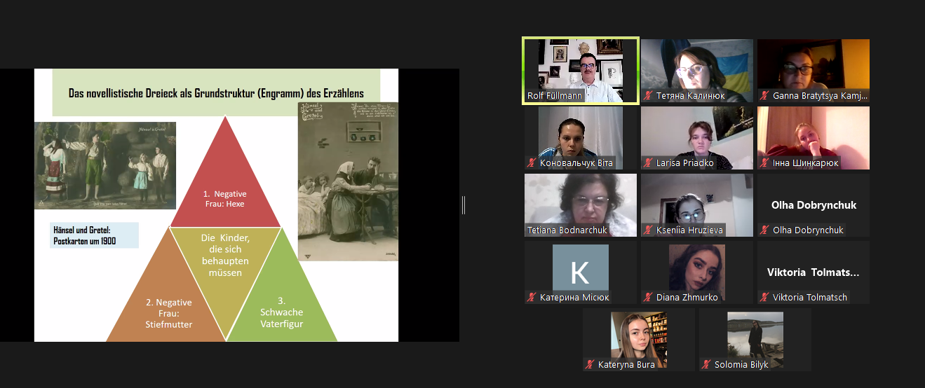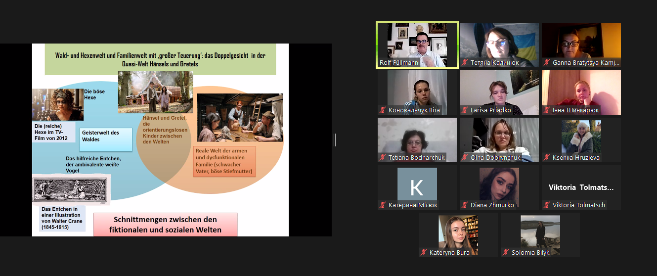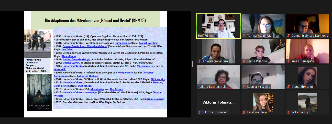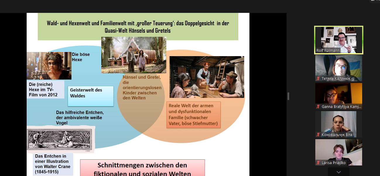 10 жовтня викладачі кафедри німецької мов та студенти-германісти продовжили роботу у проєкті «Ukraine digital». Разом із професором Кельнського університету Rolf Füllmann проаналізували змістову, лексико-стилістичну сторони однієї з казок братів Грімм «Hänsel und Gretel». Цікава презентація та майстерне прочитання твору нікого не залишили байдужим.
