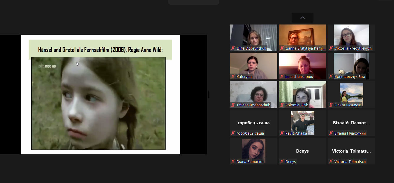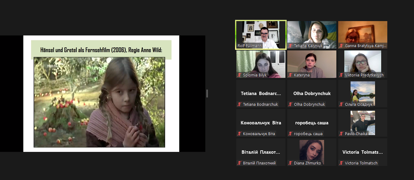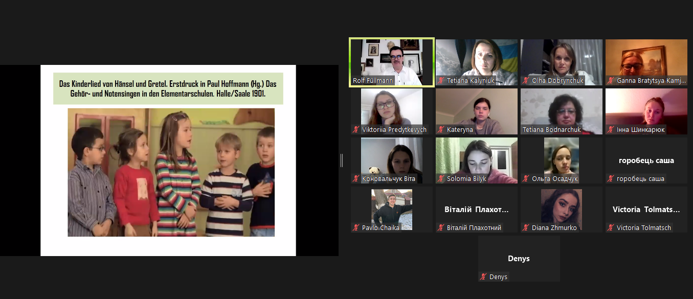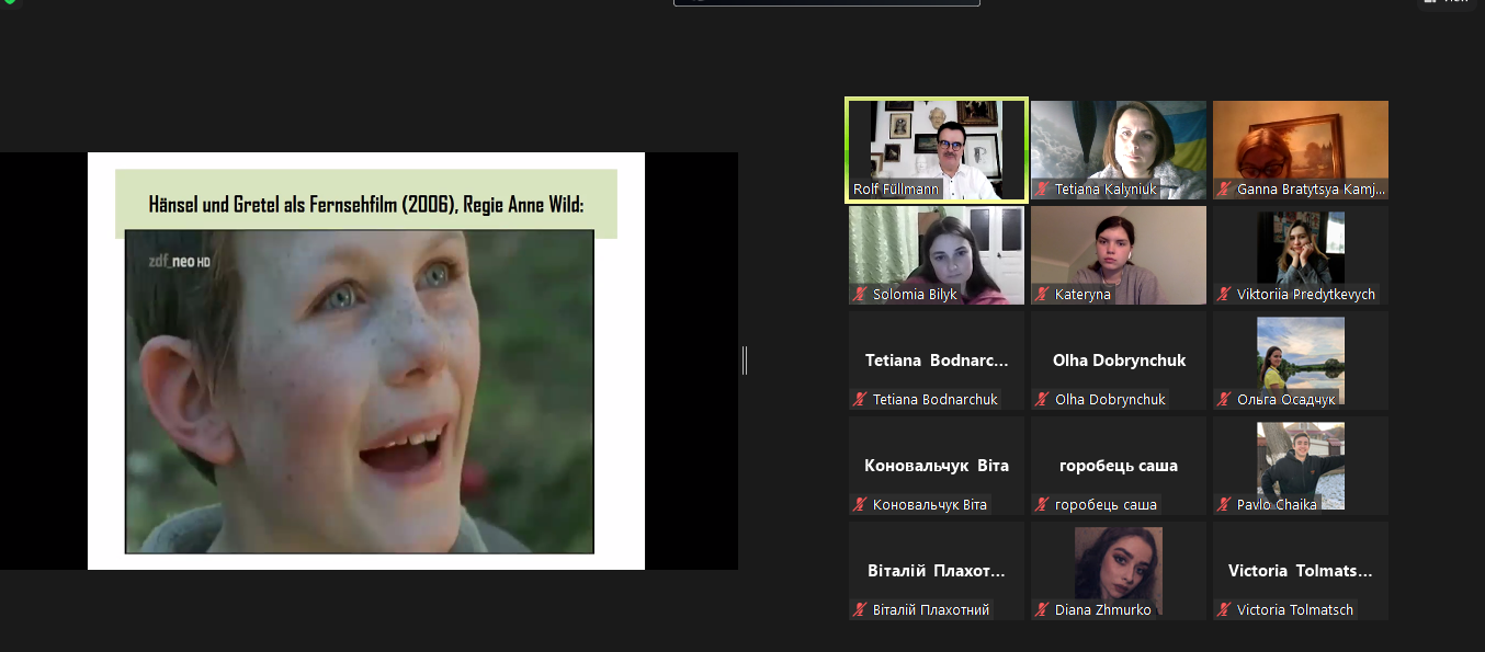 17 жовтня відбулася чергова лекція від професора Rolf Füllmann на тему «Märchen «Hänsel und Gretel» im Film: didaktische Aspekten». Учасники розглянули особливості дидактизації відомої казки братів Грімм на прикладі лялькової вистави, дитячої пісні та художнього фільму.