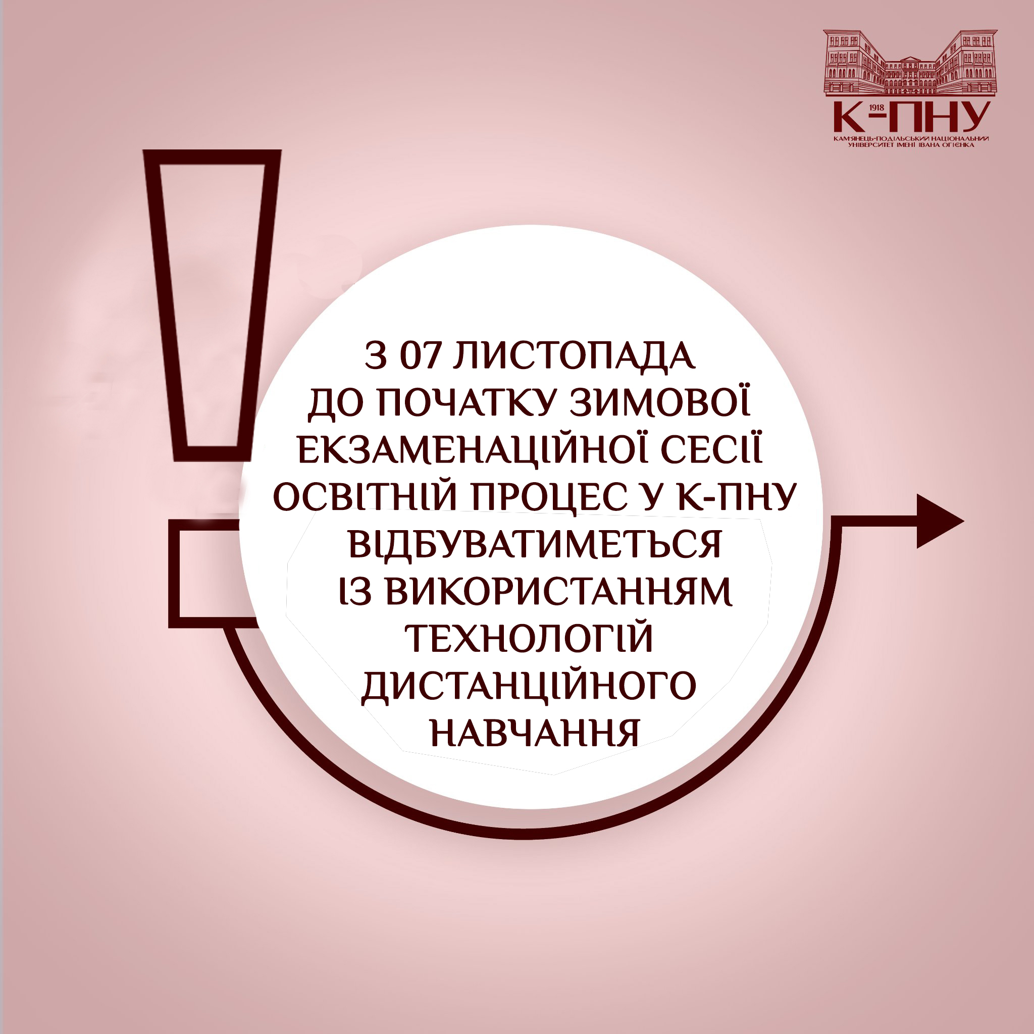 Відповідно до наказу ректора К-ПНУ Сергія Копилова «Про організацію освітнього процесу в умовах дії правового режиму воєнного стану та необхідності економії електроенергії» №138-ОД від 31.10.2022р. з 07 листопада 2022 року до початку зимової екзаменаційної сесії освітній процес для здобувачів денної та заочної форм здобуття вищої освіти відбуватиметься із використанням технологій дистанційного навчання.