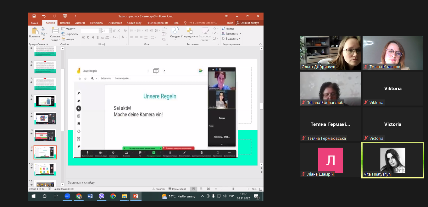 1 листопада 2022 року відбувася захист Виробничої педагогічної переддипломної практики здобувачами другого (магістерського) рівня вищої освіти спеціальності Середня освіта (Німецька мова і зарубіжна література) група Nim1-M21. Керівники практики, зокрема Тетяна Калинюк, Ольга Добринчук, Тетяна Боднарчук, а також запрошений член комісії кандидат педагогічних наук Вікторія Федорчук обговорили результати проходження практики та підвели підсумки.
