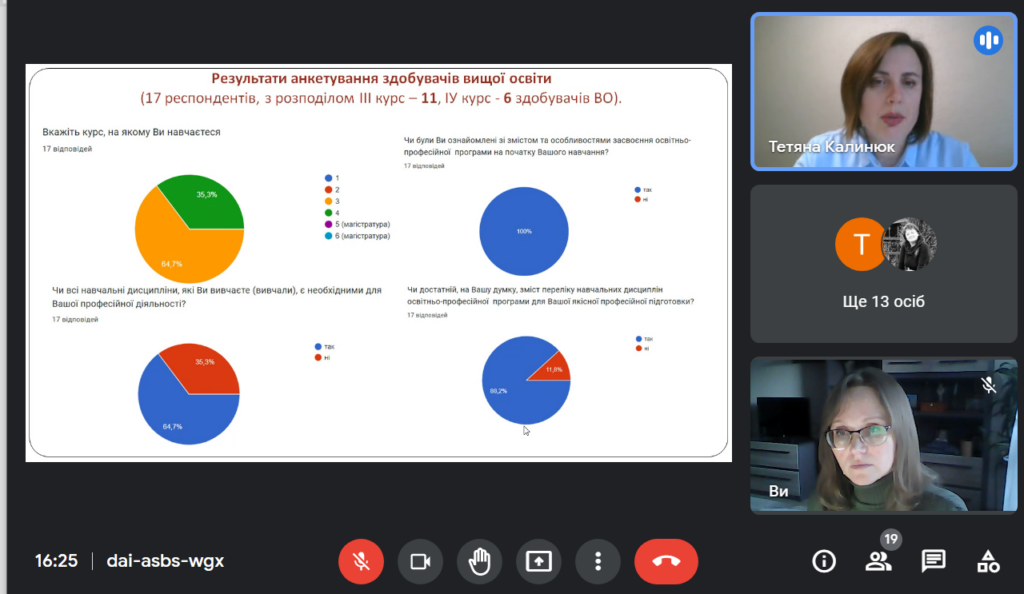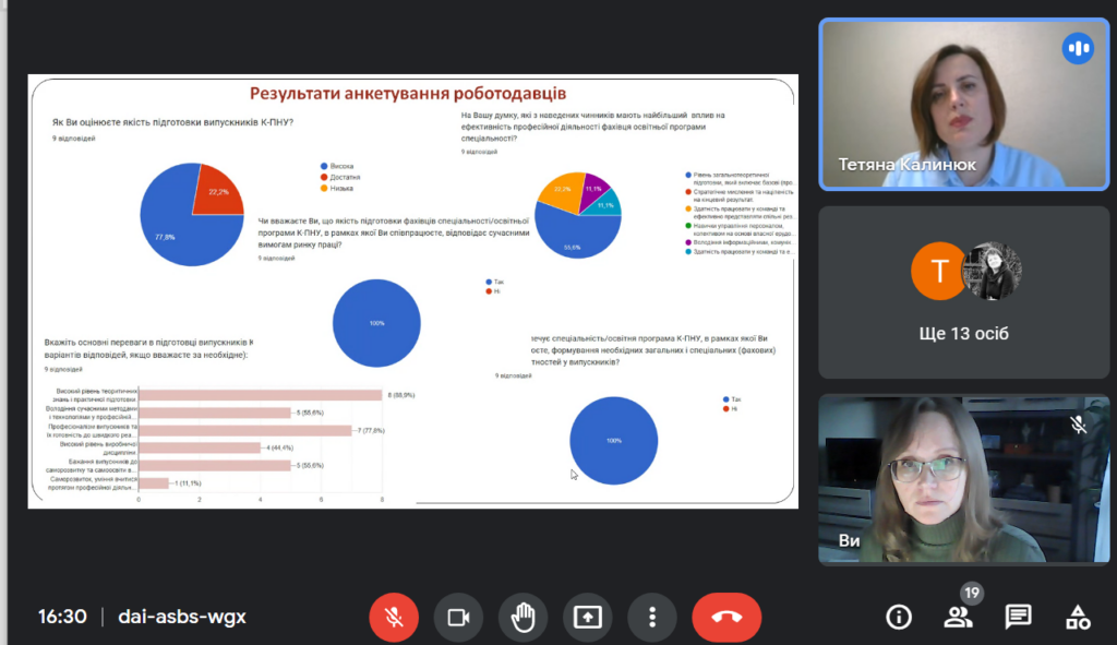 Гаранти представили результати проведених зустрічей та анкетувань різних груп стейкхолдерів (здобувачів вищої освіти, випускників і роботодавців). Доцент Тетяна Боднарчук прозвітувала про підсумки акредитаційної експертизи освітньої-програми магістерського рівня та висловила міркування щодо її удосконалення із врахування висловлених зауважень експертів. У підсумку присутні висловилися, що чинні освітньо-професійні програми відповідають вимогам підготовки фахівців за спеціальністю 014 Середня освіта (Мова і література (німецька), їх зміст вповні задовольняє потреби ринку праці. Висловлені пропозиції аналізуватимуться проєктними групами і у підсумку прийматимуться конструктивні рішення.