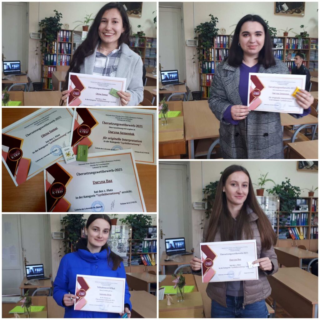 Отже, результати конкурсу такі: У категорії «Lyrikübersetzung» – Щербак Анна (І місце),   Дарина Базь та Олена Самар (ІІ місце), а також особливу відзнаку за авторську інтерпретацію отримала Дарина Семенюк.