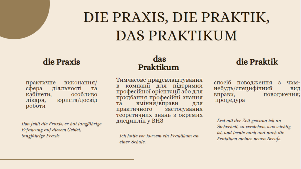 Доволі часто ми, викладачі, чуємо таке запитання “А в чому різниця між…та…?” Здобувачам освіти 3 курсу групи Nim1-B20 було запропоновано знайти відповідь на це запитання самостійно, дослідити синонімічні ряди та сфери вживання певних іменників і дієслів та розповісти про свої результати невеличкої дослідницької роботи у групі. Так і з’явився проєкт під назвою “У чому різниця між… та…?” Тепер у кожного зі здобувачів групи є невеличка презентація-підказка, яка допоможе їм не плутати, наприклад die Praxis und das Praktikum 😉