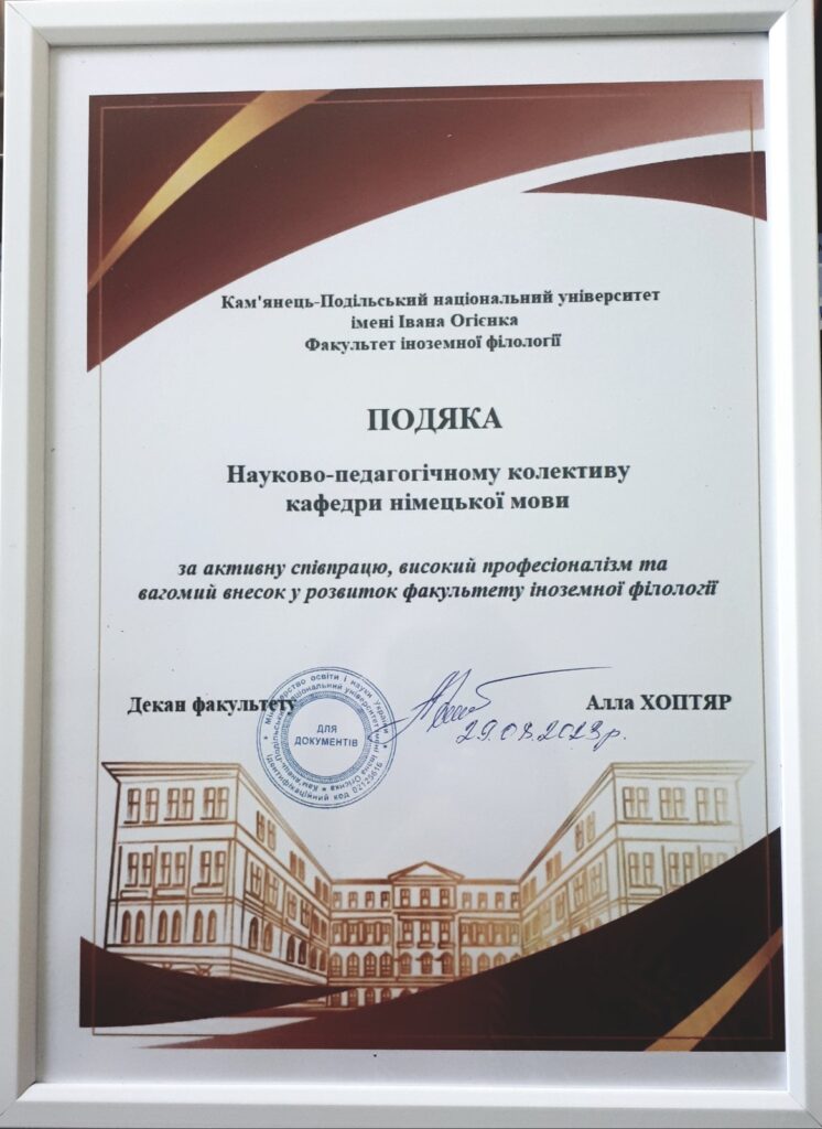 Подяка науково-педагогічному колективу кафедри німецької мови
