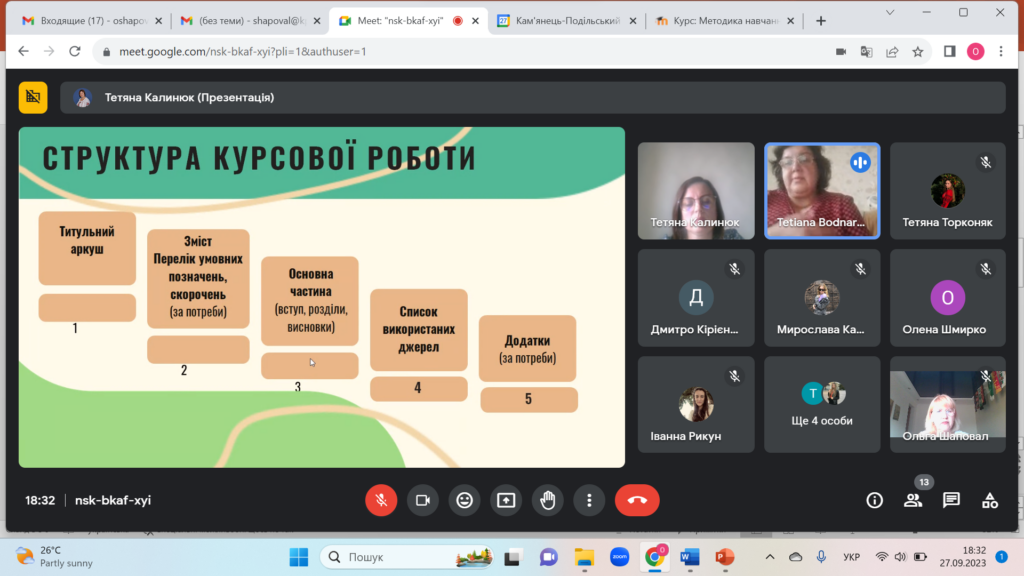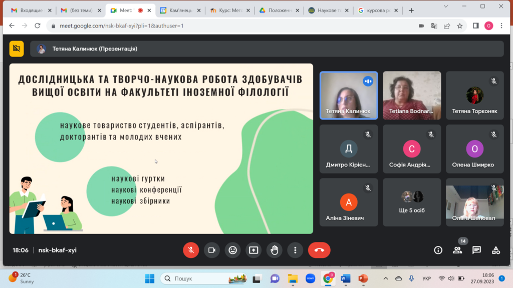 Заступник декана з наукової роботи та міжнародних зв’язків Ольга ШАПОВАЛ представила можливості наукової реалізації здобувачів вищої освіти на факультеті іноземної філології. Науково-педагогічні працівники кафедри (доценти Тетяна КАЛИНЮК та Тетяна БОДНАРЧУК, старший викладач Олена ШМИРКО) розповіли про етапи підготовки курсової роботи, вимоги до оформлення, її структуру, критерії оцінювання та розподіл балів, основні терміни виконання. Особливу увагу зосередили на дотриманні норм академічної доброчесності.