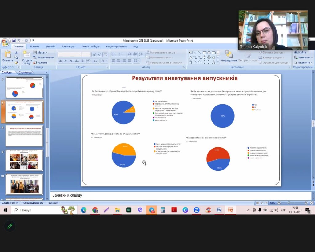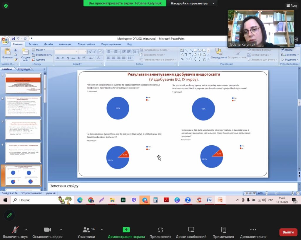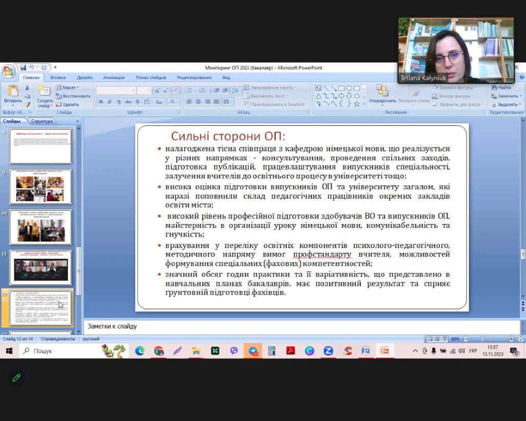 13 листопада 2023 року відбулося засідання кафедри німецької мови, де було заслухано та затверджено звіти гарантів освітньо-професійних програм першого (бакалаврського) та другого (магістерського) рівнів вищої освіти, які реалізуються кафедрою. До обговорення запрошено здобувачів вищої освіти (Саволайнен Софія та Іщук Артем (І курс), Рикун Іванна та Горобець Олександра (ІІІ курс), Білик Соломія та Усенко Дар’я (ІV курс), Предиткевич Вікторія, Шинкарюк Інна та Козерацька Маргарита (магістранти І-ІІ курсів), Венгринська Роксолана (член студентського самоврядування факультету), науково-педагогічних працівників кафедр факультету іноземної філології, вчителів (Ліпман Ольга, Осадчук Ольга). Присутні схвально висловилися стосовно проведеного моніторингу та його результатів.