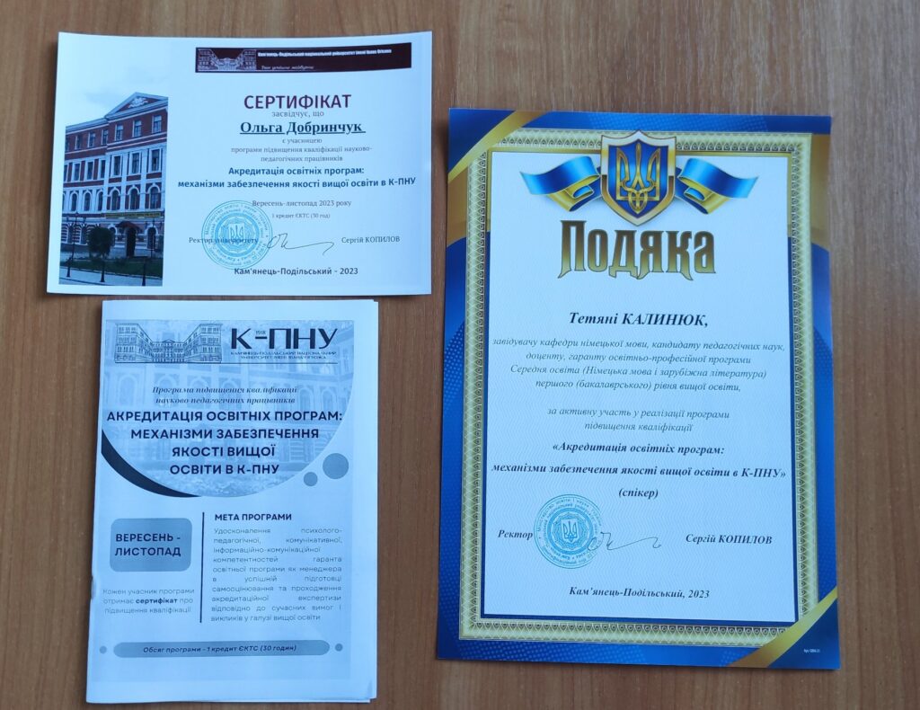 Упродовж вересня-листопада 2023 р. кандидат філологічних наук, доцент Ольга ДОБРИНЧУК пройшла підвищення кваліфікації за програмою «Акредитація освітніх програм: механізми забезпечення якості вищої освіти в К-ПНУ», яку для науково-педагогічних працівників університету розробив та реалізував навчально-методичний відділ (керівник – кандидат філологічних наук, доцент Наталія ГУДИМА). Програма зорієнтована на удосконалення психолого-педагогічної, комунікативної, інформаційно-комунікаційної компетентностей гаранта освітньої програми. Як спікер тренінгу «Лайфхак від успішного гаранта» виступила завідувач кафедри німецької мови, кандидат педагогічних наук, доцент Тетяна КАЛИНЮК.