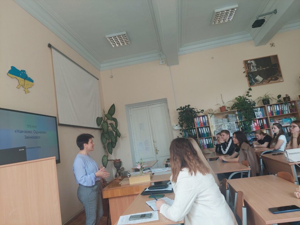 На запрошення кафедри германських мов та зарубіжної літератури здобувачі вищої освіти факультету іноземної філології стали учасниками тренінгу «Оцінювання в НУШ: як оцінювати без знецінювання», який провела вчитель української мови і літератури, зарубіжної літератури, тренерка НУШ Наталія Рудніцька. На цікавих прикладах спікерка продемонструвала нову «філософію оцінювання» в НУШ, продемонструвала учасникам приклади з власного досвіду. Студенти працювали у групах та розв’язували практичні кейси з проведення оцінювання на уроці НУШ.