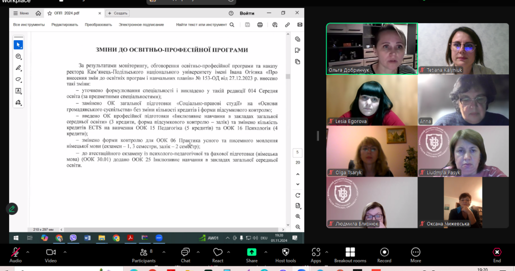 01 листопада 2024 року завідувач кафедри доц. Тетяна КАЛИНЮК та гаранти освітньо-професійних програм першого та другого рівнів вищої освіти ініціювали зустріч академічної спільноти та рецензентів чинних освітніх програм (Ольга ЦАРИК, професор кафедри іноземних мов та інформаційно-комунікаційних технологій Західноукраїнського національного університету, доктор педагогічних наук, професор; Людмила ПАСИК, завідувач кафедри німецької філології Волинського національного університету імені Лесі Українки, кандидат філологічних наук, доцент; Людмила БЛИЗНЮК, доцент кафедри німецької філології Волинського національного університету імені Лесі Українки, кандидат філологічних наук, доцент; Оксана ЧИЖЕВСЬКА, директор Кам’янець-Подільського ліцею №15; Леся ЄГОРОВА, вчитель німецької мови Хмельницької гімназії №21). Предметом обговорення стало обмін досвідом реалізації подібних програм підготовки вчителів іноземних мов і зарубіжної літератури, а також впровадження ефективних шляхи інтеграції сучасних педагогічних підходів і новітніх технологій в освітній процес.