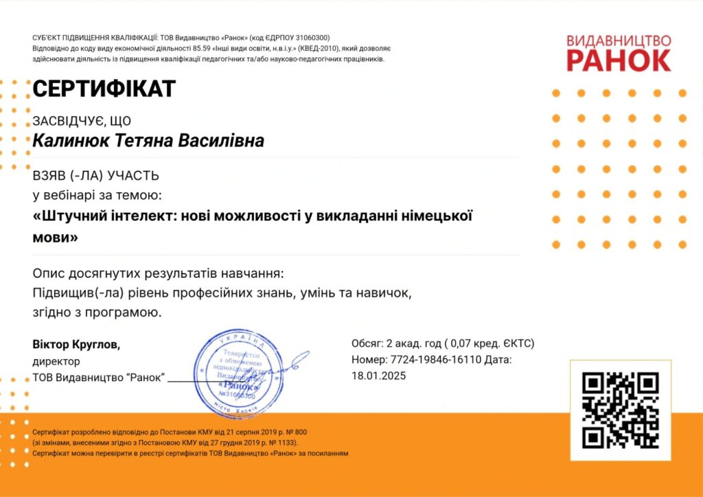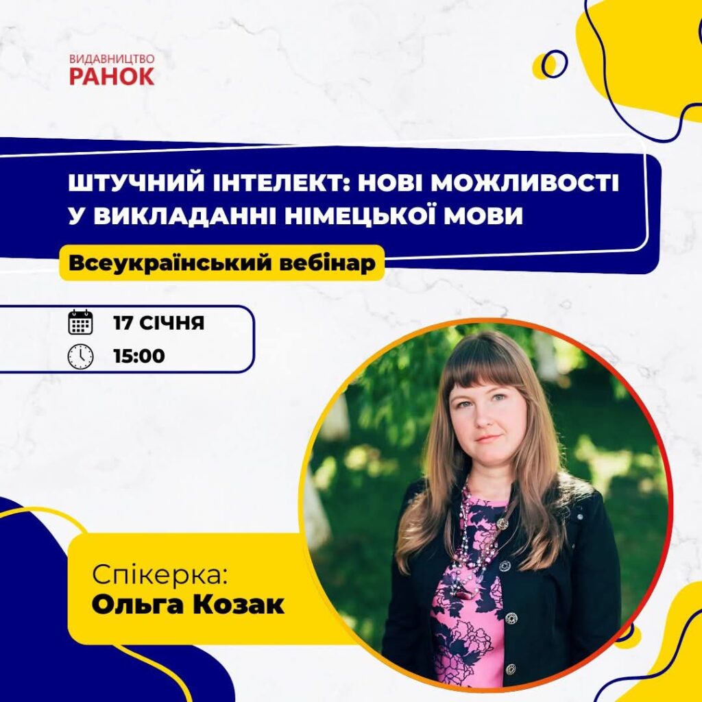 17 січня 2025 року доц. Тетяна КАЛИНЮК взяла участь у вебінарі на тему «Штучний інтелект: нові можливості у викладанні німецької мови» від видавництва «РАНОК» (спікер – Ольга КОЗАК, методист з німецької мови).