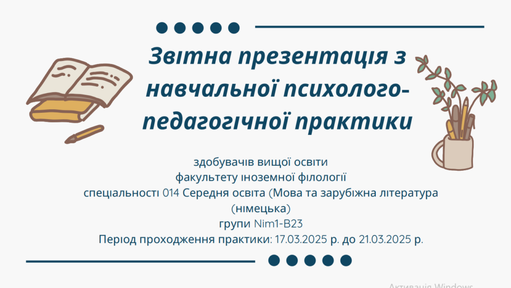 16-21 березня 2025 року здобувачі вищої освіти 2 курсу, які навчаються за ОП «Середня освіта (Мова і література (німецька, англійська)», проходили навчальну психолого-педагогічну практику у ліцеях Кам’янця-Подільського. Її метою є формування компетентностей здобувачів вищої освіти шляхом ознайомлення їх зі специфікою майбутнього фаху у закладі загальної середньої освіти, ознайомлення з психолого-педагогічними та організаційними умовами освітньої діяльності в закладах освіти.