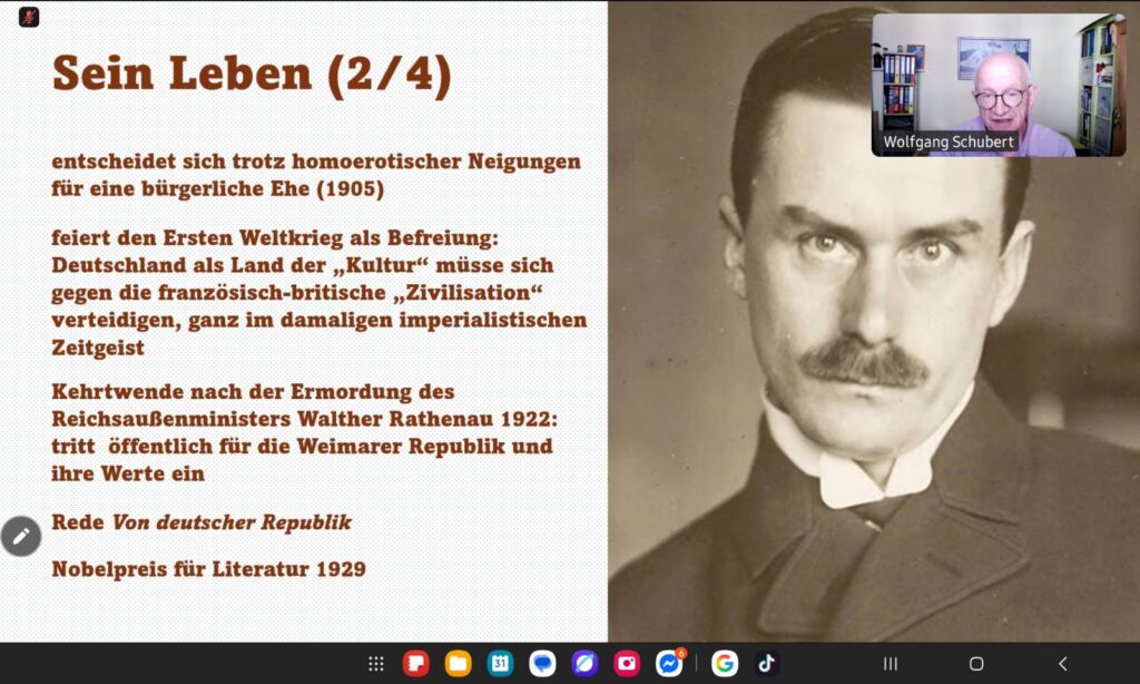 31 травня доц. Ольга Добринчук відвідала онлайн-вебінар, присвячений німецькому письменнику Томасу Манну. 6 червня виповнюється 150 років з дня народження відомого німецького класика. Він був лауреатом Нобелівської премії та автором відомих інтелектуальних романів, таких як “Будденброки” та “Зовсім нерозумна смерть”. З цієї нагоди лектор Wolfgang Schubert (організація Freundschaft kennt keine Grenzen) провів цікавий вебінар, присвячений життєвому та творчому шляху відомого письменника. Учасники вебінару поділилися досвідом “знайомства” із творами Томаса Манна, прослухали оригінальні аудіозаписи, в яких повідомлялося про присвоєння Томасу Манну Нобелівської премії і, загалом, дізналися цікаві факти про життя та творчість одного з найвизначніших класиків німецької літератури.