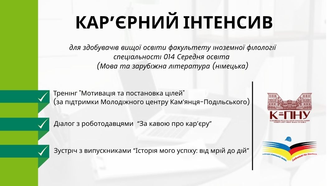 Запрошуємо здобувачів вищої освіти факультету іноземної філології взяти участь у «Кар’єрному інтенсивні», у рамках якого заплановано проведення низки заходів: тренінг “Мотивація та постановка цілей” (за підтримки Молодіжного центру Кам’янця-Подільського), діалог з роботодавцями “За кавою про кар’єру”, зустріч з випускниками “Історія мого успіху: від мрій до дій”, тощо.