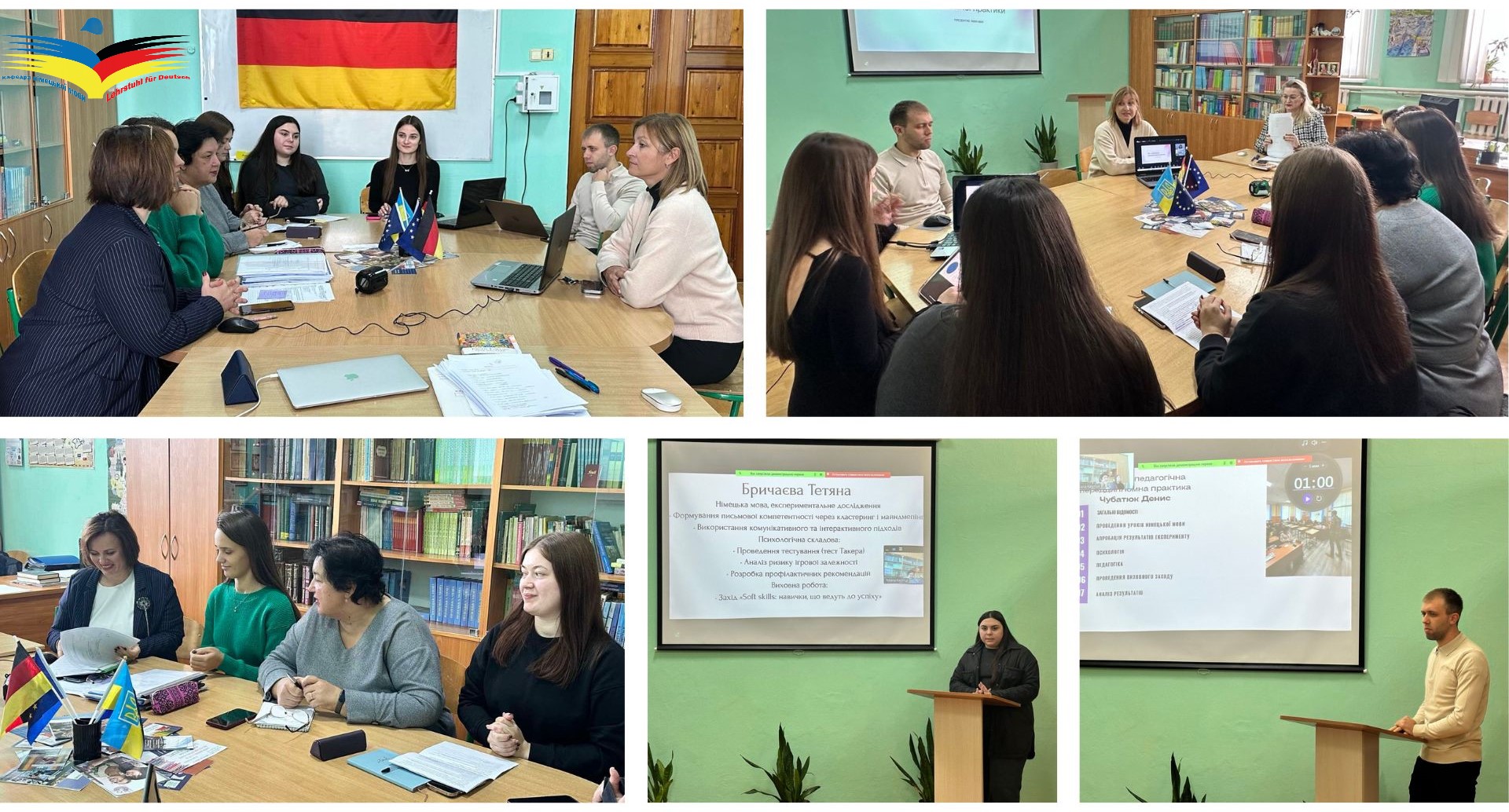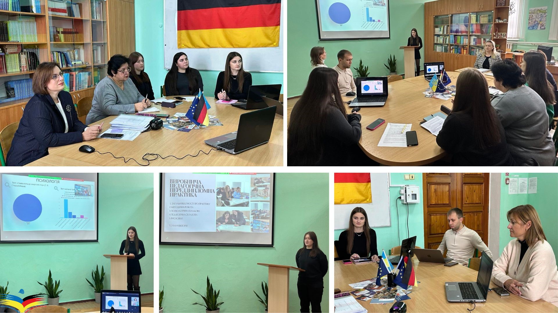Магістранти другого курсу освітньо-професійної програми «Середня освіта (Німецька мова та зарубіжна література)» успішно завершили виробничу педагогічну переддипломну практику. На обговорення матеріалів практики були запрошенні як керівники практики від профільних кафедр (доц. Тетяна Калинюк, доц. Тетяна Боднарчук, доц. Ольга Добринчук, ст. викл. Ганна Братиця, доц. Олена Дутко), так і вчителі німецької мови від бази практики (Ольга Осадчук та Ольга Ліпман).