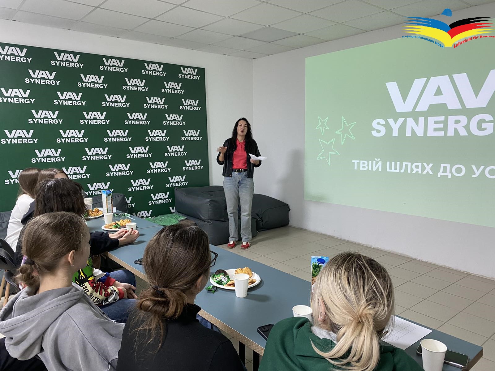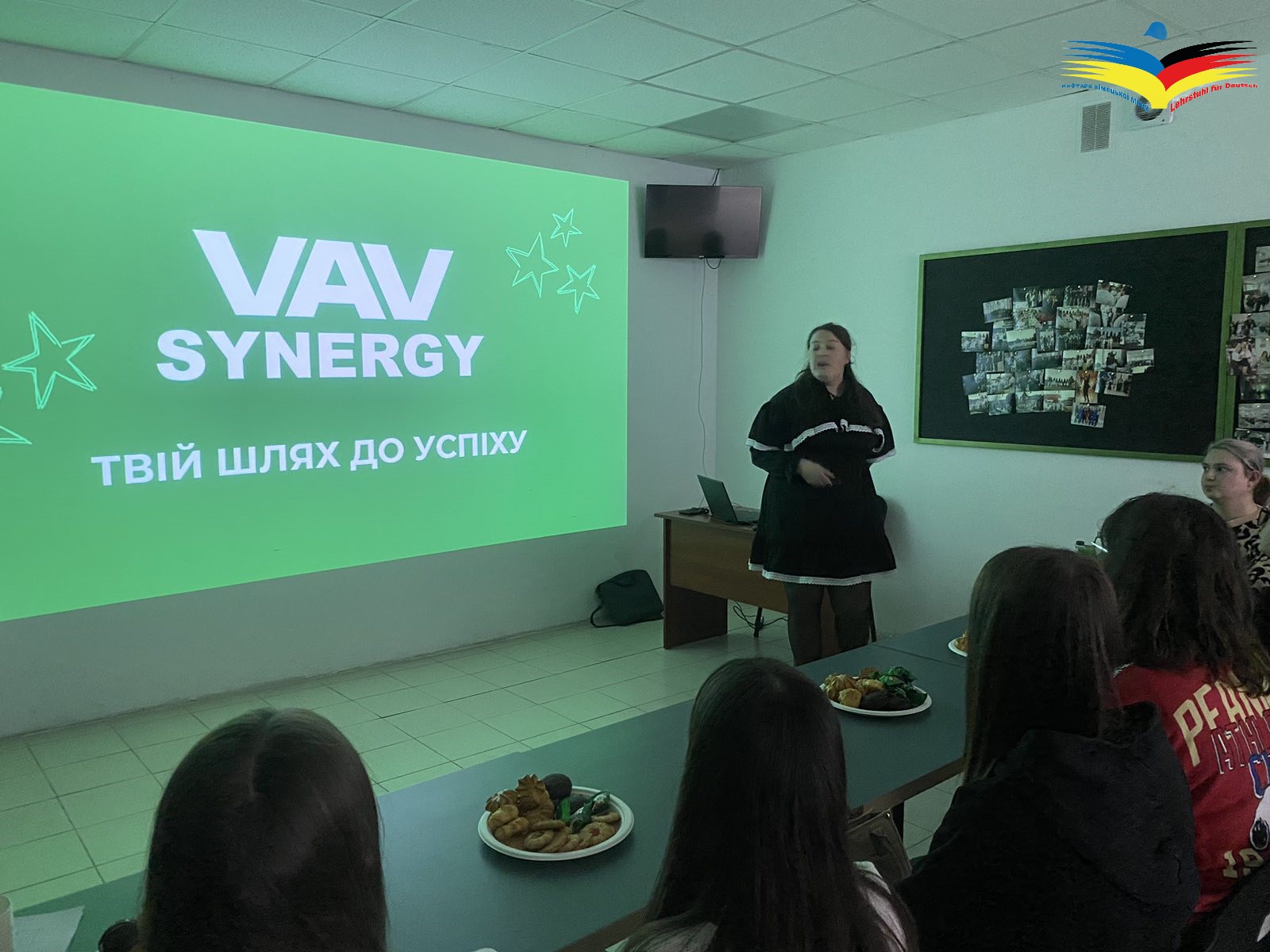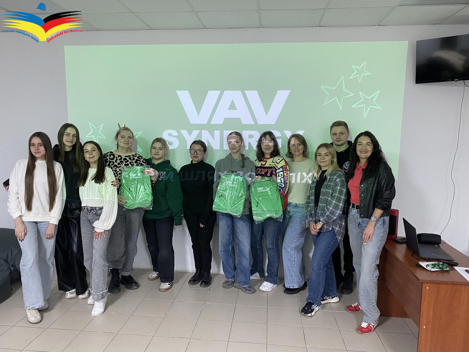 Під час зустрічі студенти ознайомилися з діяльністю компанії, структурою відділів і специфікою роботи фахівців, що володіють іноземними мовами. Представники Vav Synergy поділилися інформацією про можливості працевлаштування, умови стажування та кар’єрного зростання для молодих спеціалістів, які володіють німецькою/англійською мовами.