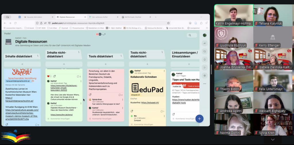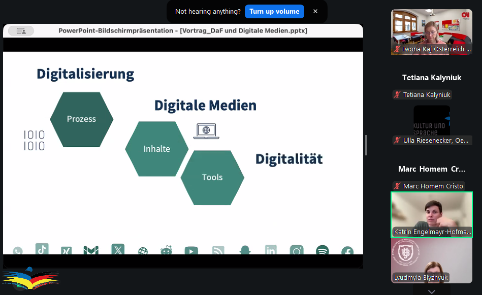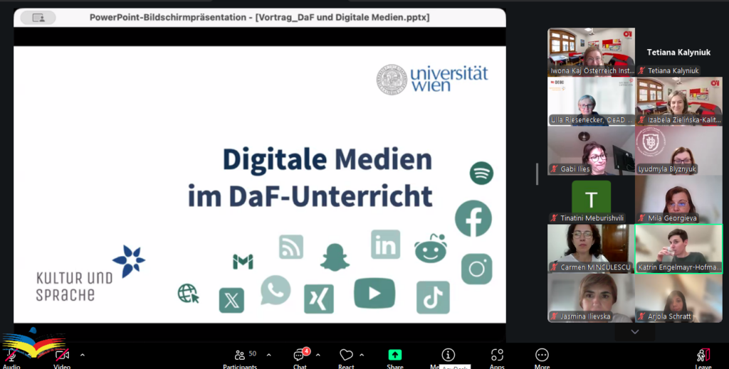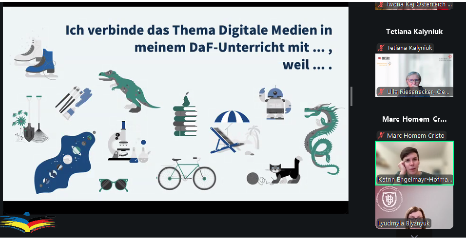Доцент Тетяна КАЛИНЮК разом зі магістрантами першого та другого курсів ОП «Середня освіта (Німецька мова і зарубіжна література») взяли участь у фаховому семінарі «Digitale Medien im DaF–Unterricht»,який організований освітнім центром „Kultur und Sprache“ Universität Wien. Тема заходу була присвячена актуальним питанням використання цифрових технологій у викладанні німецької мови як іноземної (DaF).
