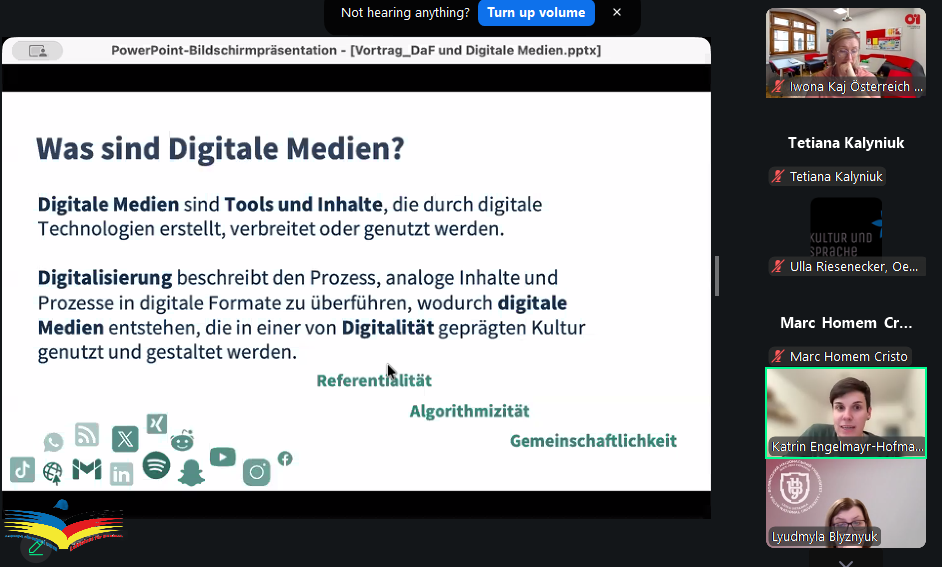 Під час семінару модераторка Katrin ENGELMAYR-HOFMANN розглянула ключові поняття медіакомпетентності та медіаграмотності, їх значення для сучасного освітнього процесу та формування критичного мислення. Особливу увагу було приділено практичним аспектам роботи з медіаконтентом і можливостям його дидактизації за допомогою різноманітних цифрових інструментів.