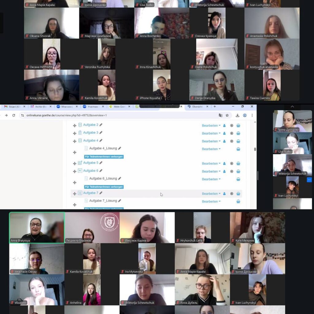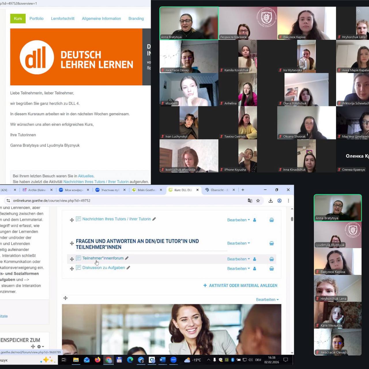 Під час першої онлайн-зустрічі тьютори Ганна Братиця (К-ПНУ) та Людмила Близнюк (ВНУ) детально розповіли про особливості проходження курсу, формат навчання та ознайомили студентів із ресурсами платформи. Навчання проходитиме у форматі blended learning, що поєднує онлайн-активності з практичною взаємодією та самостійною роботою у межах навчальної дисципліни “Методика навчання німецької мови”.
