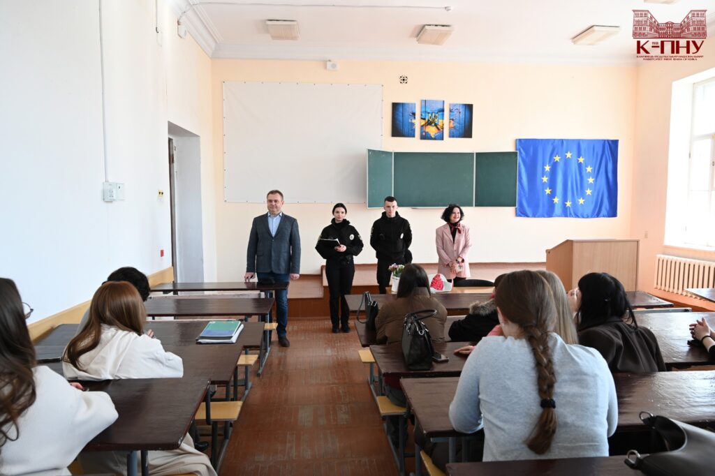 9 березня 2026 року на факультеті іноземної філології К-ПНУ відбулася зустріч здобувачів вищої освіти з представниками правоохоронних органів. Темою зустрічі стало обговорення питань, що стосуються попередження протиправних дій серед здобувачів вищої освіти та застереження їх від можливих небезпек, зокрема в умовах сучасних соціальних і політичних реалій.