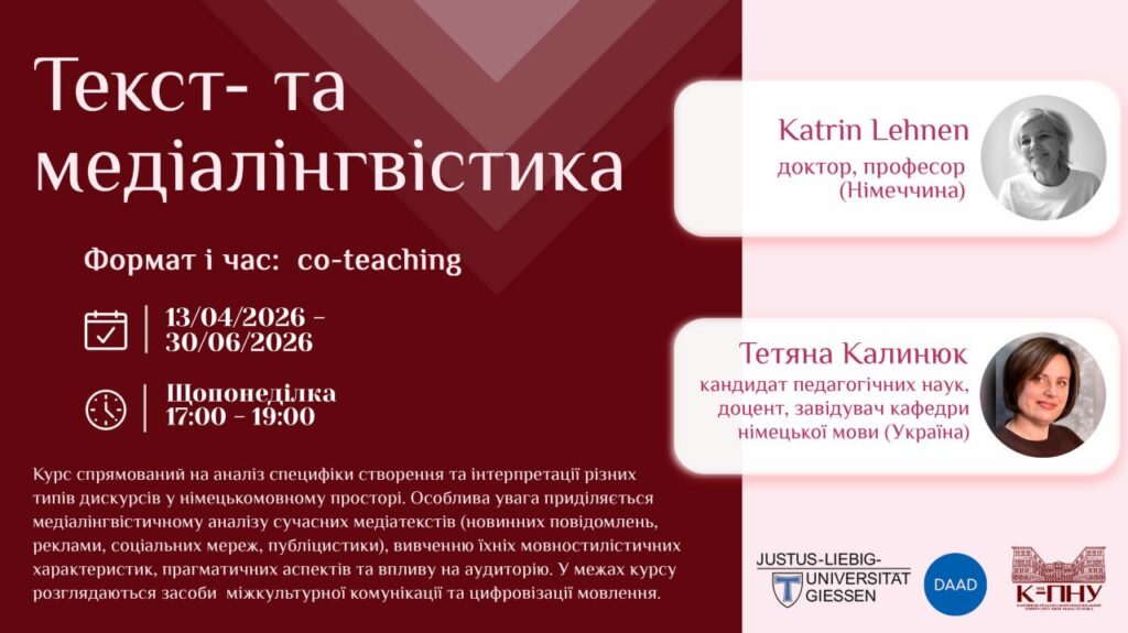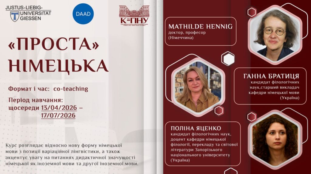 У межах програми науково-педагогічні працівники кафедри німецької мови (Тетяна КАЛИНЮК, Ганна БРАТИЦЯ, Ольга ДОБРИНЧУК) проводитимуть начальні семінари спільного викладання разом із колегами Гіссенського Університету Юстуса Лібіха (JLU, Gießen) – Mathilde Hennig, Katrin Lehnen, Julianna Dube. Це унікальна можливість навчатися у міжнародному середовищі, вдосконалювати німецьку мову та занурюватися у міжкультурну комунікацію.