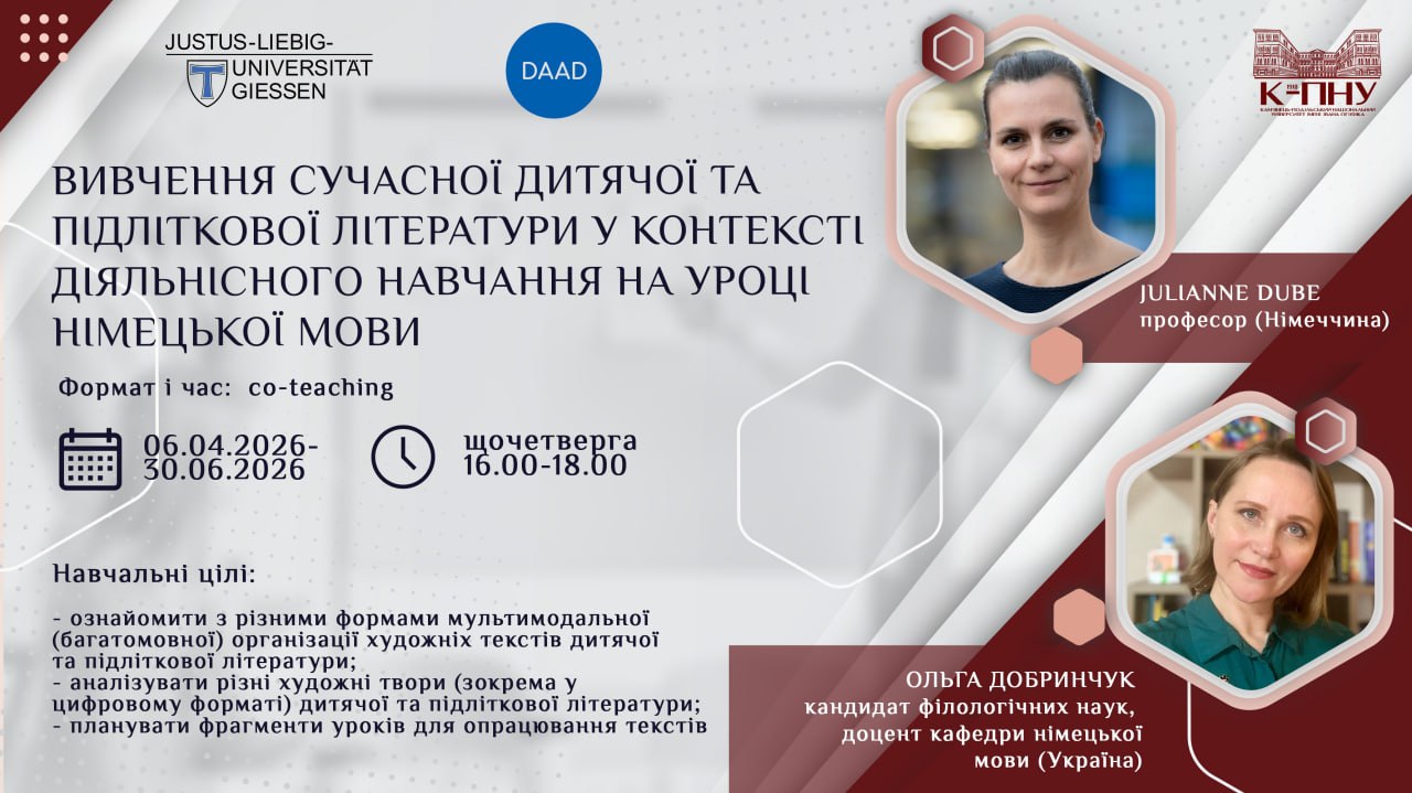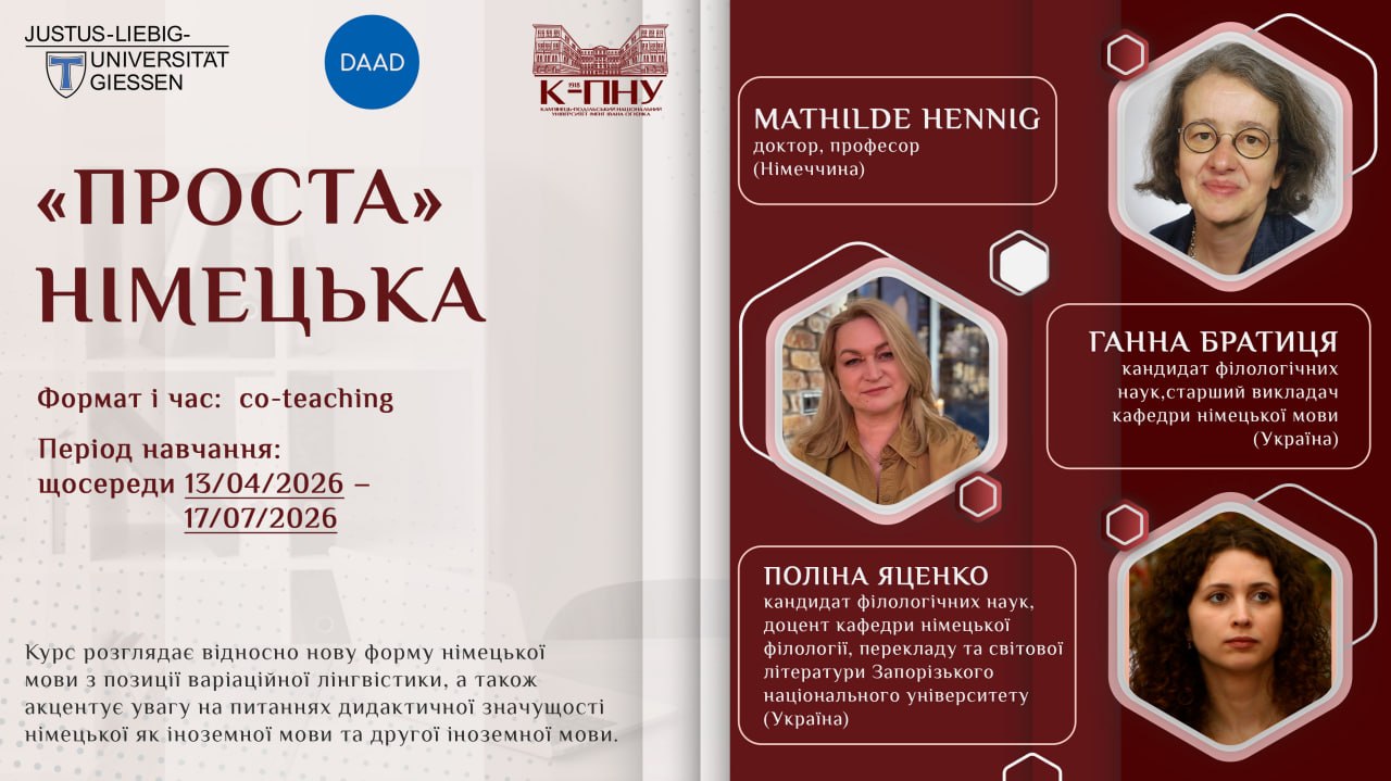 У межах програми науково-педагогічні працівники кафедри німецької мови (Тетяна КАЛИНЮК, Ганна БРАТИЦЯ, Ольга ДОБРИНЧУК) проводитимуть начальні семінари спільного викладання разом із колегами Гіссенського Університету Юстуса Лібіха (JLU, Gießen) – Mathilde Hennig, Katrin Lehnen, Julianna Dube. Це унікальна можливість навчатися у міжнародному середовищі, вдосконалювати німецьку мову та занурюватися у міжкультурну комунікацію.