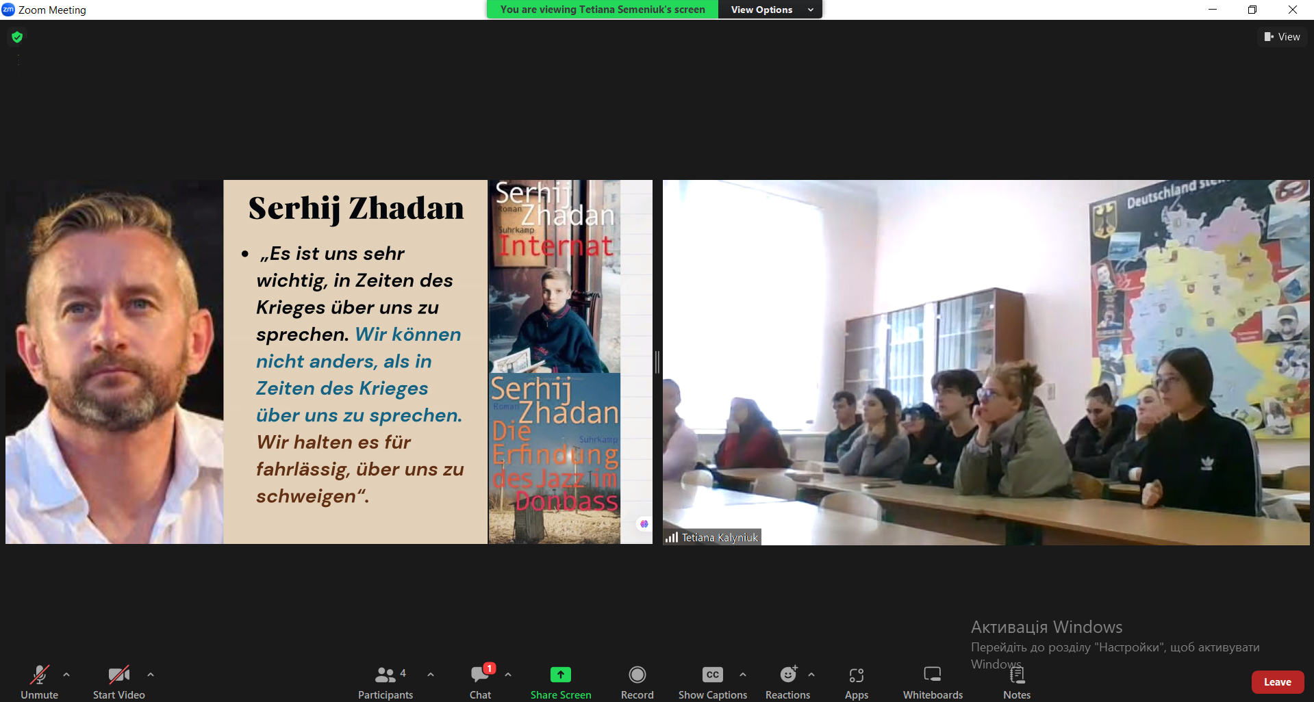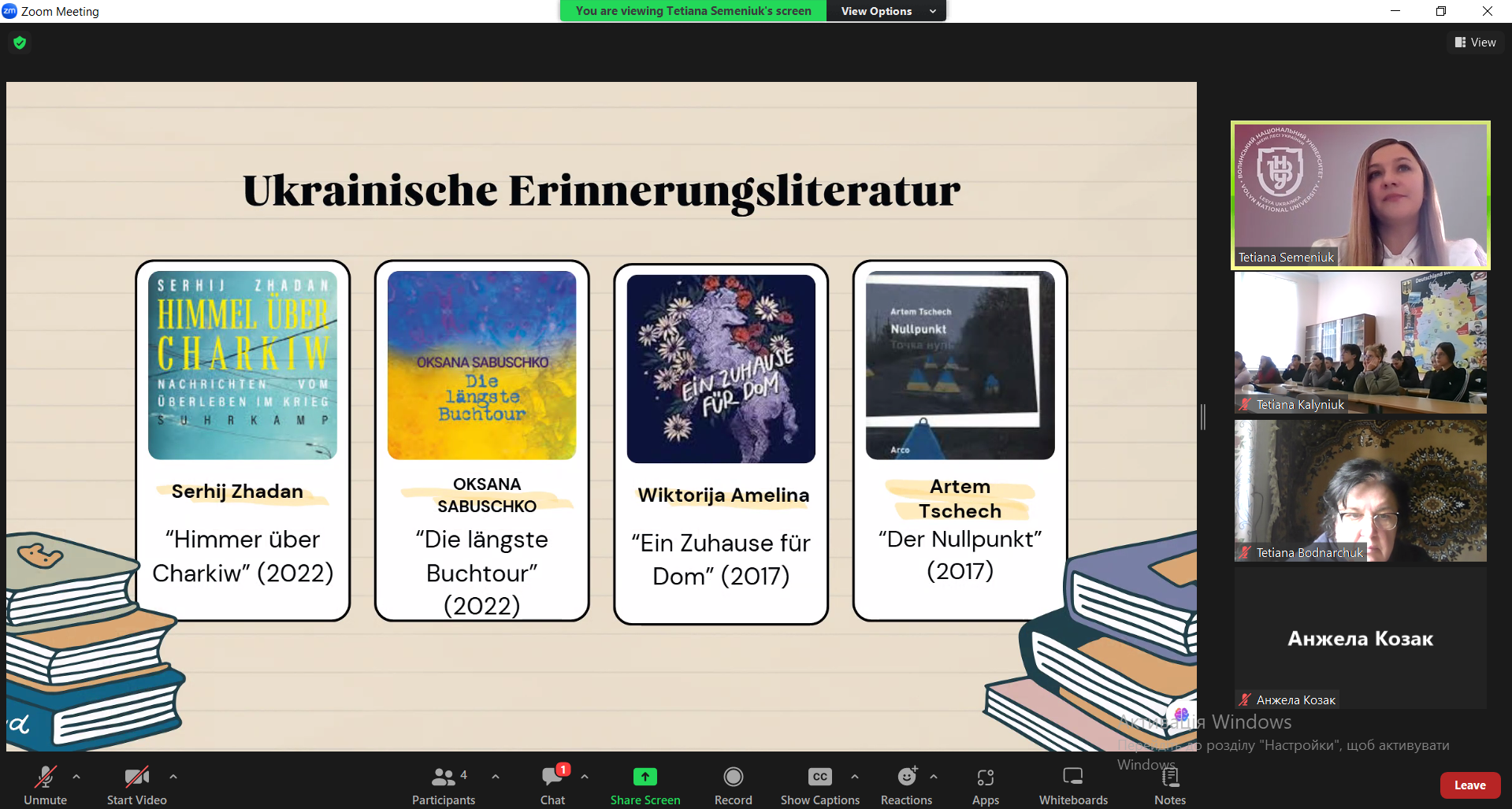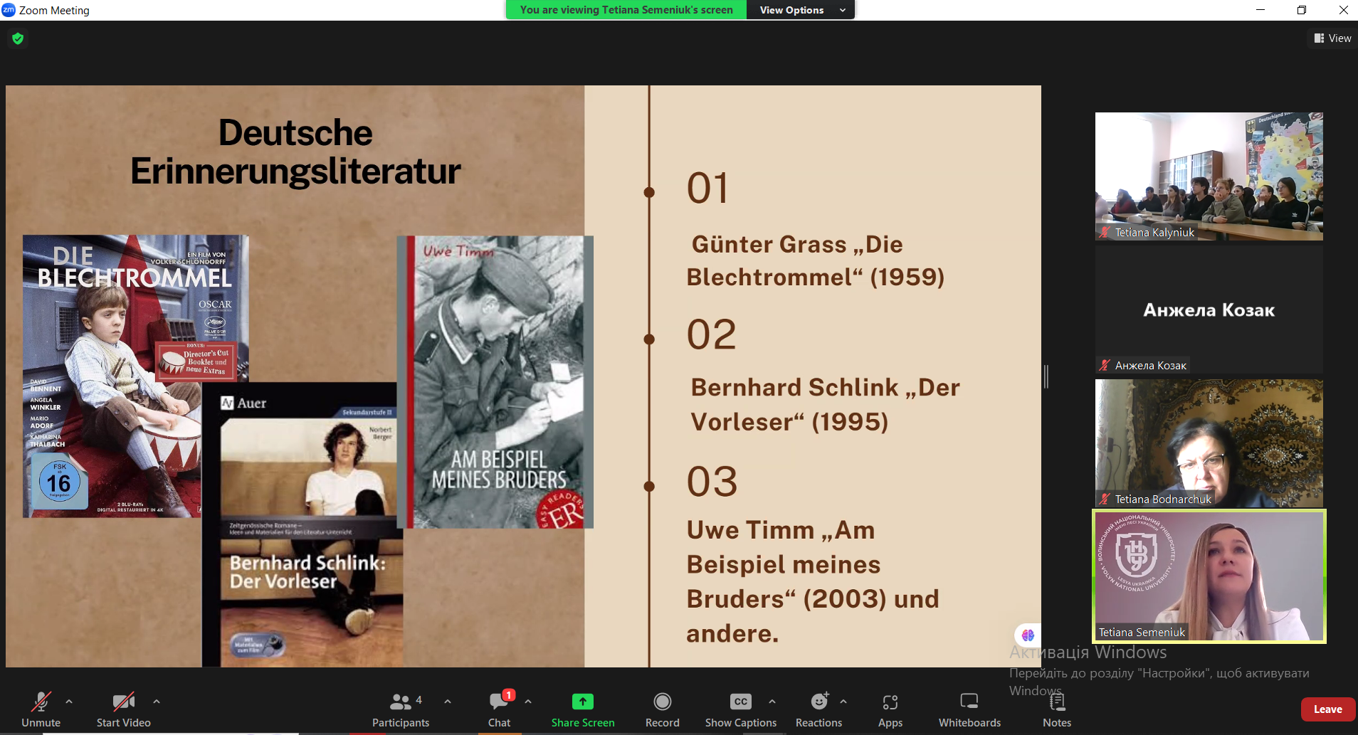 У межах освітньо-наукової співпраці кафедри німецької мови Кам’янець-Подільського національного університету ім. Івана Огієнка та кафедри німецької філології Волинського національного університету ім. Лесі Українки відбулася гостьова лекція на тему «Literatur als Medium der Erinnerung: Deutsche und ukrainische Autoren im Kampf gegen das Vergessen». Спікеркою виступила кандидат філологічних наук, доцент, доцент кафедри німецької філології Тетяна СЕМЕНЮК.
