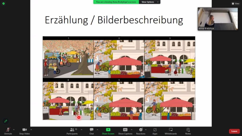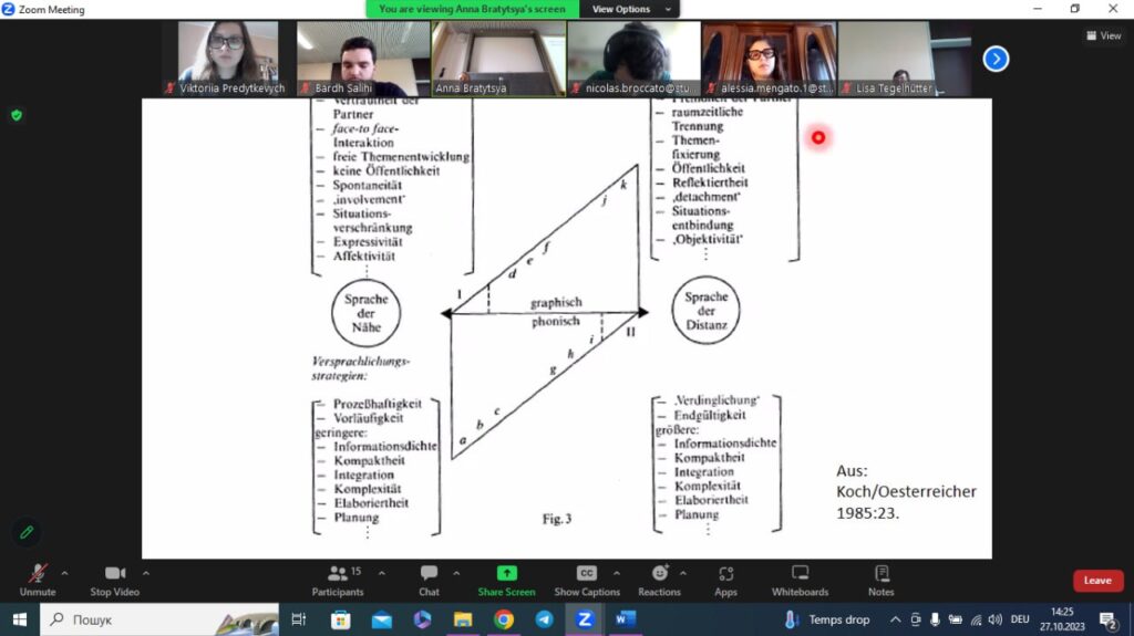На курсі «Schreiben in der Zweit- und Fremdsprache Deutsch» (лектори – доктор Яна ГАМПЕР та кандидат філологічних наук Ганна БРАТИЦЯ) працювали на семінарі, де передбачено опанування трьох підтем: «Erstsprache, Zweitsprache, Fremdsprache» («Перша мова, друга мова, іноземна мова»), «Sprachverietäten» («Мовні варіанти»), «Schriftlichkeit/Mündlichkeit» («Письмове та усне мовлення»). Під час заняття разом опрацьовували такі проблемні питання: визначали різницю між першою, другою мовами та іноземною мовою; аналізували мовні варіанти; досліджували різницю між усним та письмовим мовленням. Загалом, семінар пройшов цікаво й продуктивно. Кожен з нас отримав завдання на наступний тиждень.