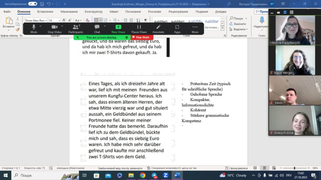 Під час семінару «Aktuelle Tendenzen Kinder– und Jugendliteratur» (лектори – доктор Крістен ПРІНЦ та доцент Ольга ДОБРИНЧУК) на тему «Brüdern Grimm: Haus- und Kindermärchen. Merkmale und Entstehungshintergrund und Merkmale moderner Märchen», студенти ґрунтовно досліджували казки братів Грімм «Пані Метелиця» та «Король-жабеня або залізний Генріх». Разом із іноземними колегами аналізували персонажів, визначали специфічні особливості німецької народної казки, обговорювали їх символізм. Задля оптимізації робити, лекторка об’єднала присутніх в інтернаціональні групи. Такий вид діяльності виявився досить продуктивним, адже кожен зі студентів мав теоретичні знання, а також особистий досвід, що дало можливість успішно організувати командну роботу. Підсумки обговорення кожна група візуалізувала на віртуальній дошці.