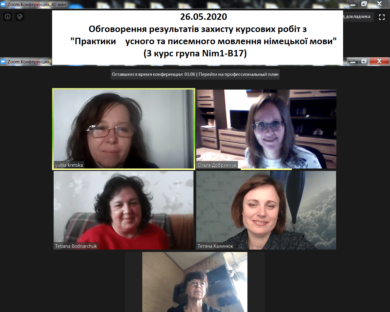 26 травня 2020 року на кафедрі німецької мови відбувся захист курсових робіт здобувачів вищої освіти першого (бакалаврського) рівня з навчальної дисципліни «Практика усного та писемного мовлення німецької мови». Наукові роботи студенти презентували у програмі PowerPoint на платформі Zoom.