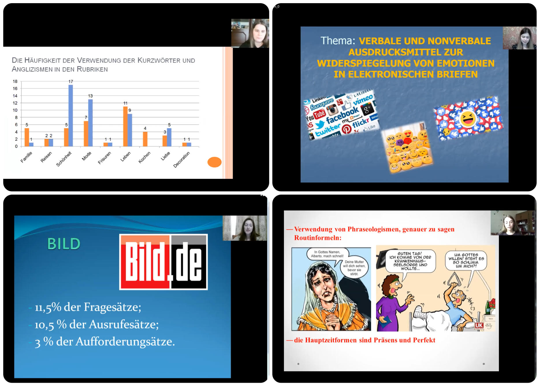 Усі дослідження підготовлені та захищені німецькою мовою. Теми включали різні аспекти вивчення мови, зокрема синтаксичні та мовні особливості сучасної німецькомовної преси, німецький сленг, засоби вираження емоцій у мові Інтернету, вербальні та паравербальні особливості німецькомовних коміксів, функціональні аспекти фразеологізмів з біблійними компонентами тощо. Результати досліджень викликали інтерес та жваве обговорення серед членів комісії, що свідчить про те, що роботи були цікавими.